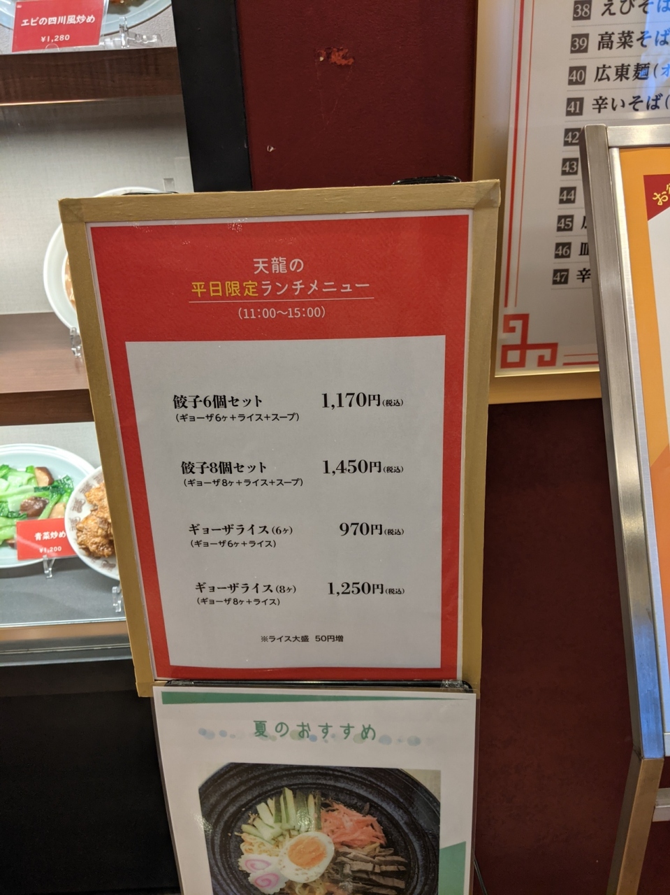 池袋東武12階のレストラン街にある中華料理店、銀座の有名店の支店です。時間帯によっては行列ができることも。ランチタイムに名物のジャンボ餃子6個にライスがついたセットメニューも。