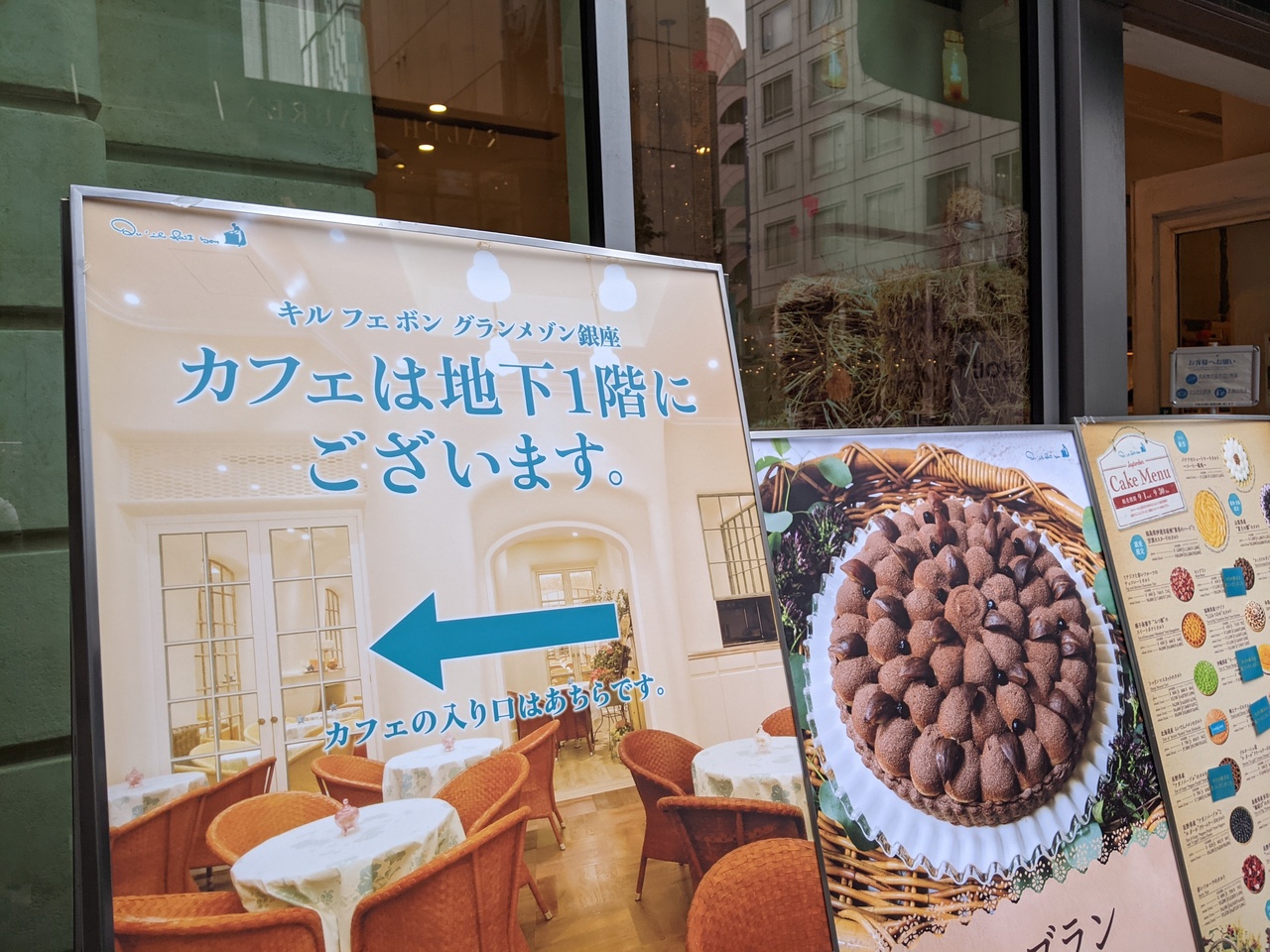 銀座のキルフェボンは1階がテイクアウトのケーキ店、地下1階にカフェがあります。