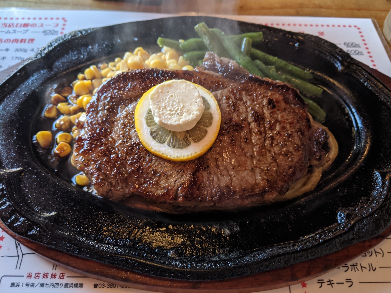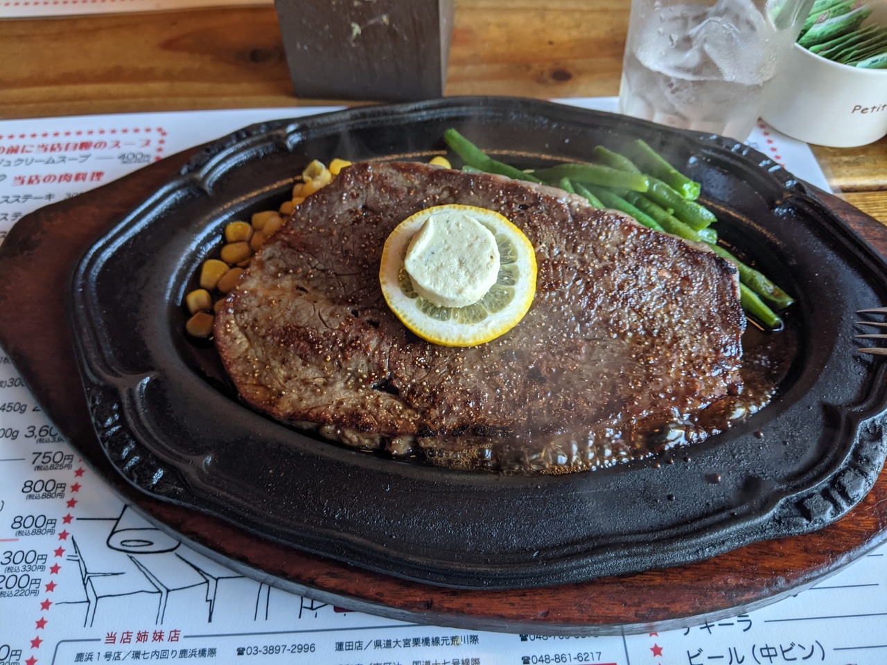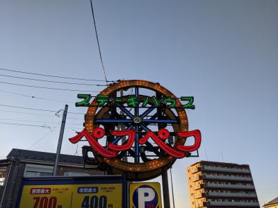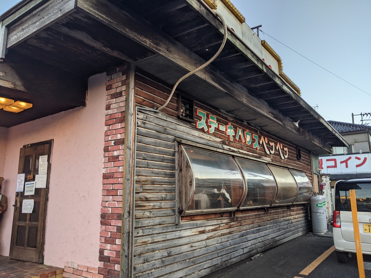 国道17号線と東京外環自動車道が交わるあたりにあるステーキハウス。キラキラネオンが目立ちますが建物はカントリー風。ちょっと入りにくい雰囲気ではありますが‥美味しいステーキがお手頃価格でいただけます。オーストラリア産リブロース肉の「ペコペコステーキ」はジューシーで美味しいお肉でした。お店のおすすめ「ドッキリステーキ」も注文、ハラミ成形肉のステーキなので柔らかくて美味しかったです。