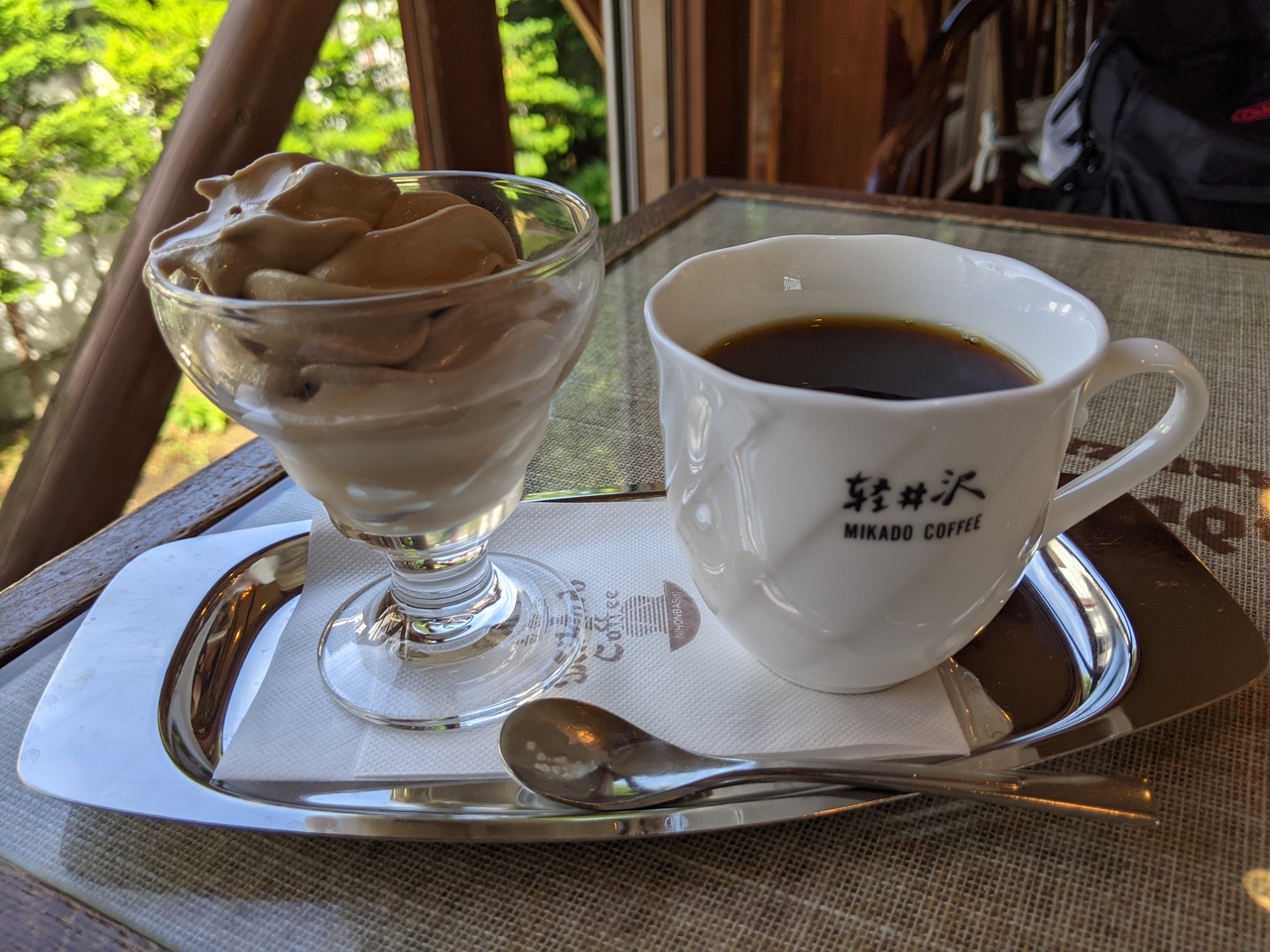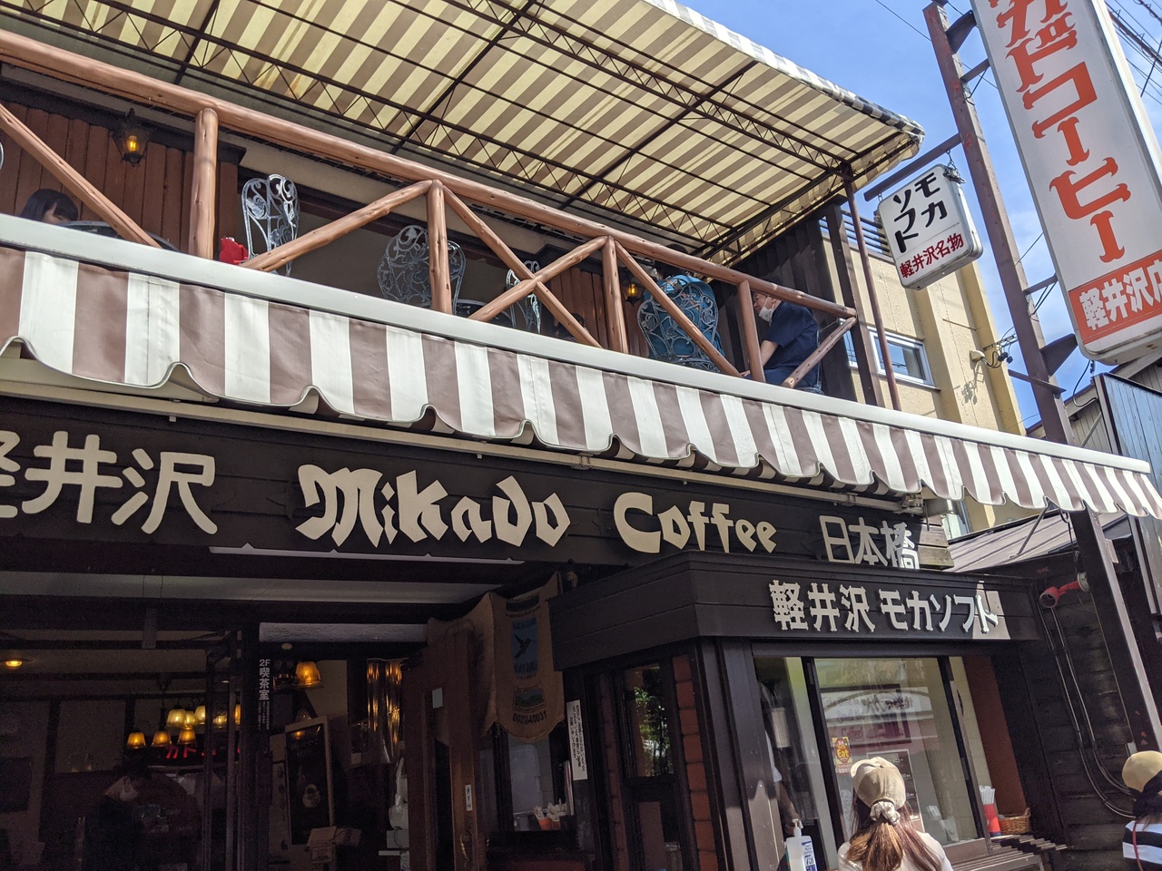 旧軽井沢のミカドコーヒー、日本橋が本店ですが軽井沢の顔のようなイメージがあるのは私だけでしょうか?テラスもあるウッディな店構えでとても落ち着きます。モカソフトとコーヒーのセットをいただきましたが酸味の効いたコーヒーに甘さ控えめのモカソフト、どちらもとても美味しかったです。コロナ禍のせいか、季節によるのかわかりませんが、この日は15:30ラストオーダー、16:00閉店でしたので来店時、営業時間には注意が必要です。
