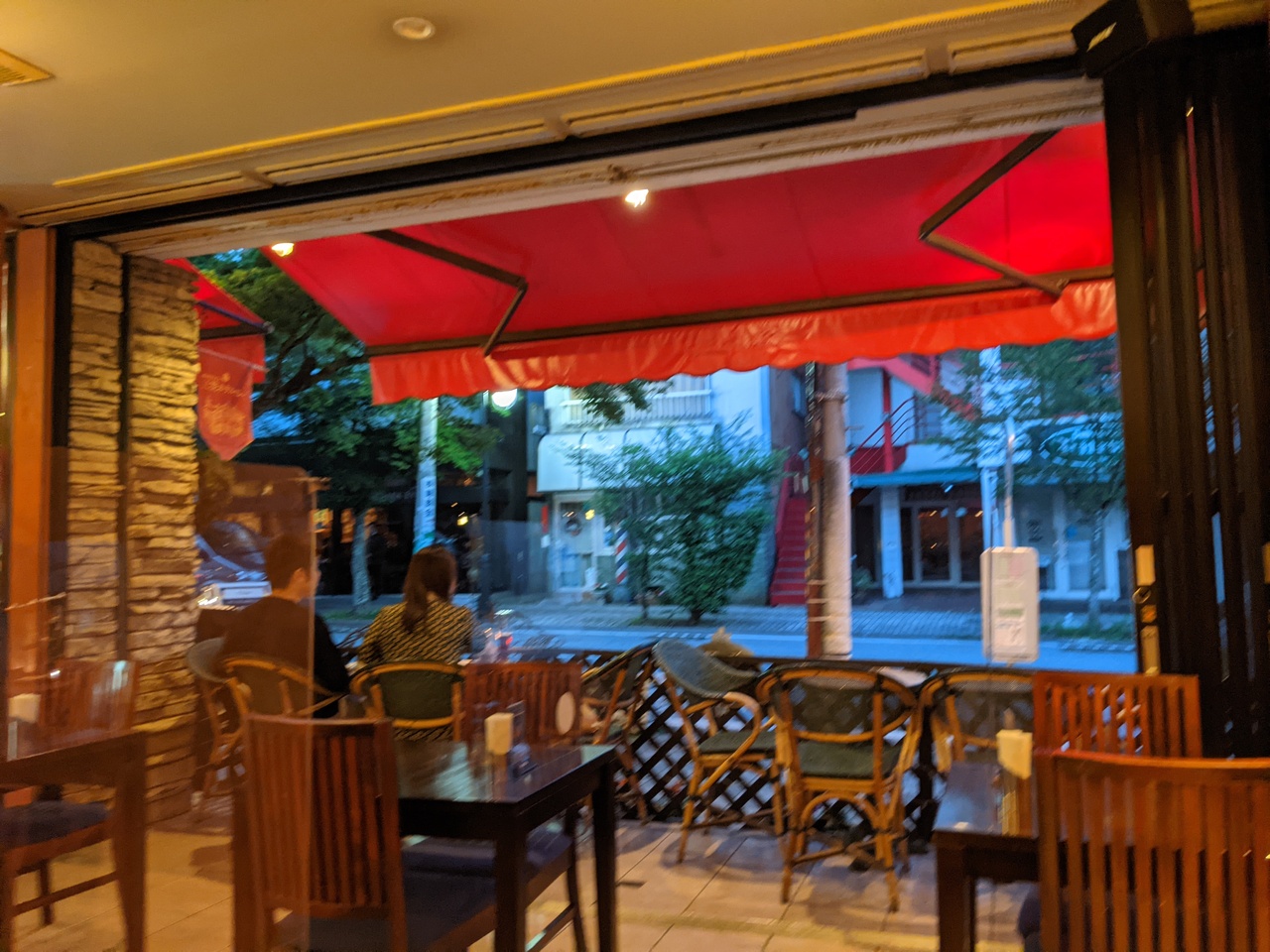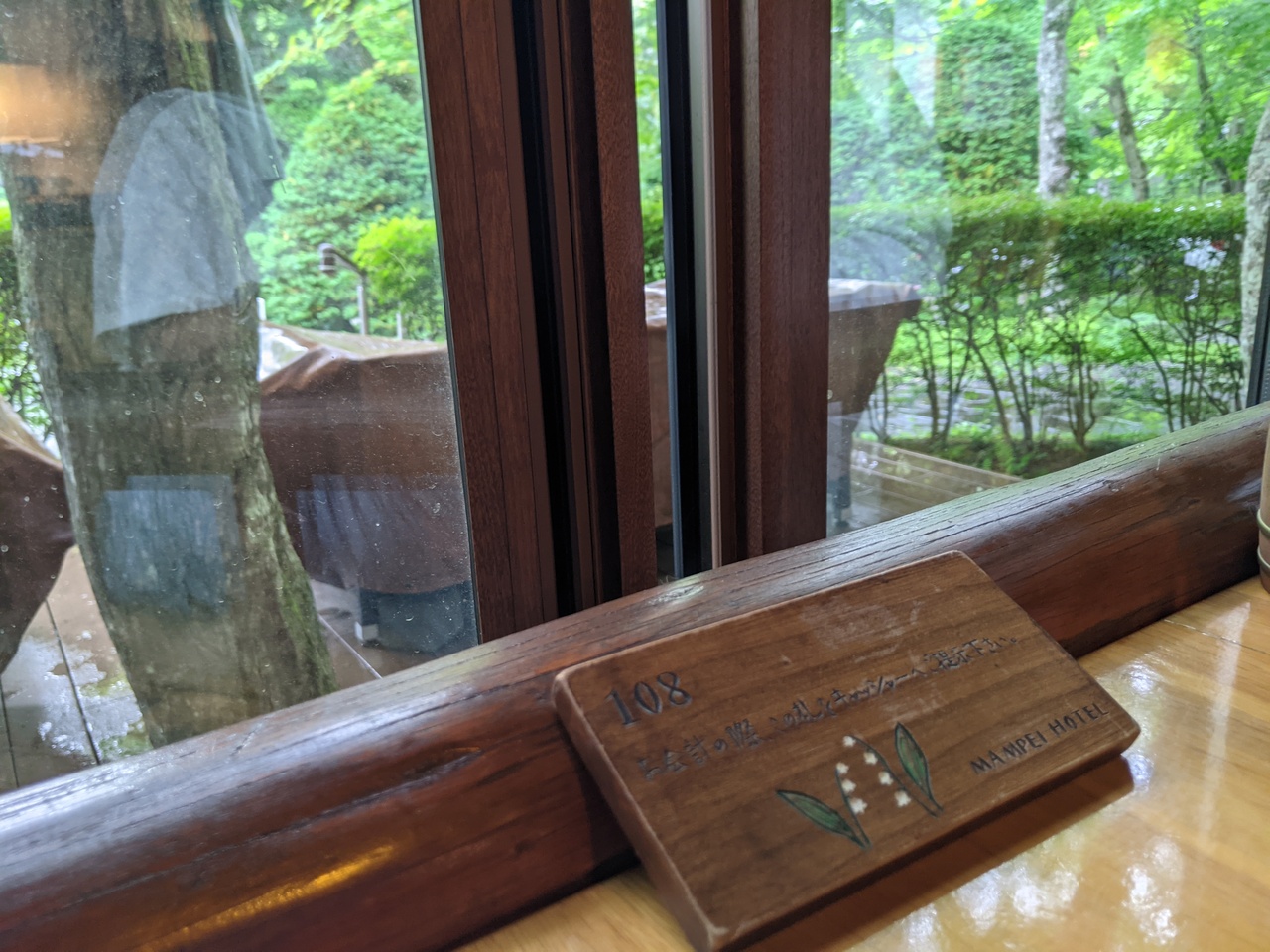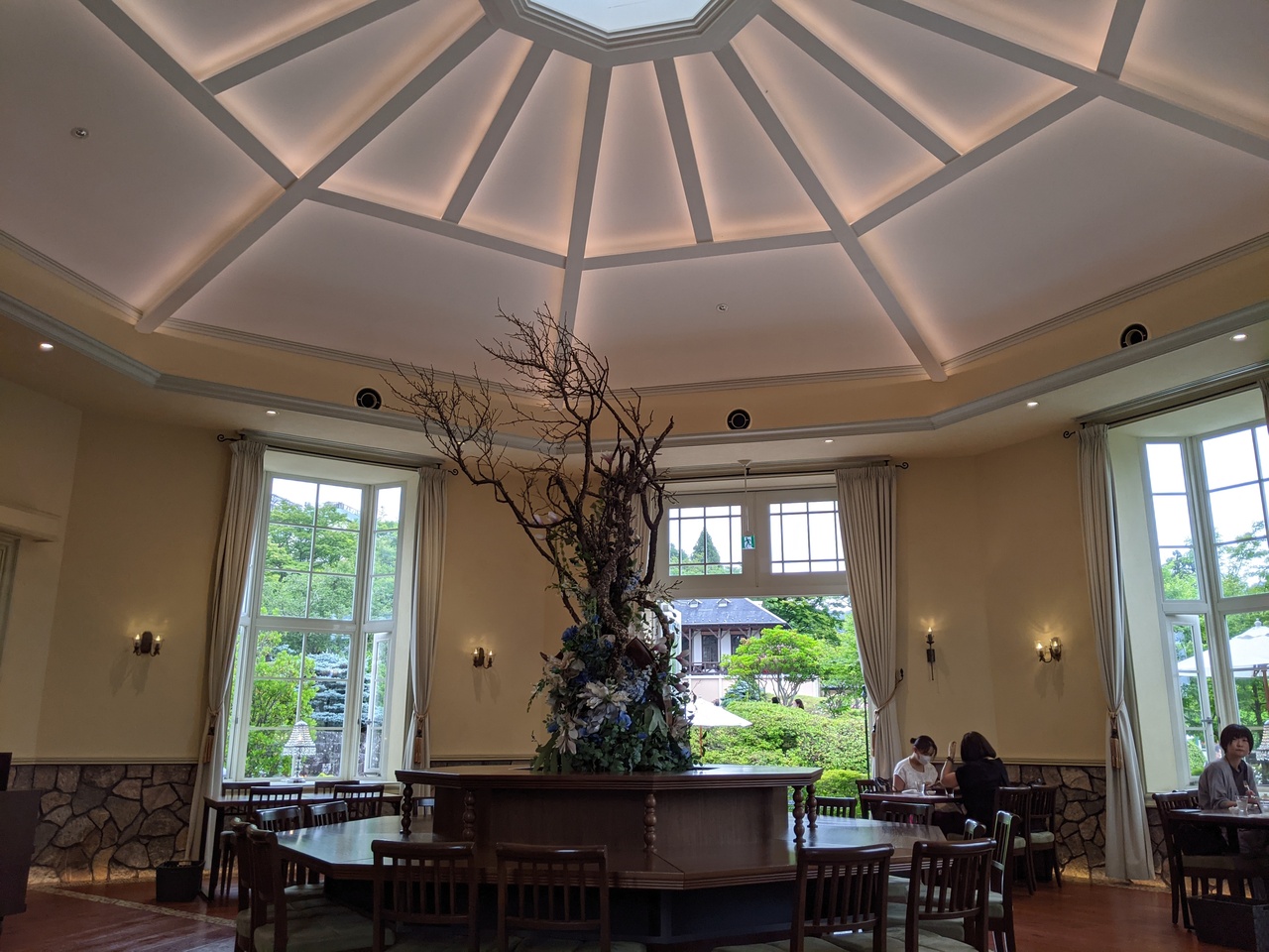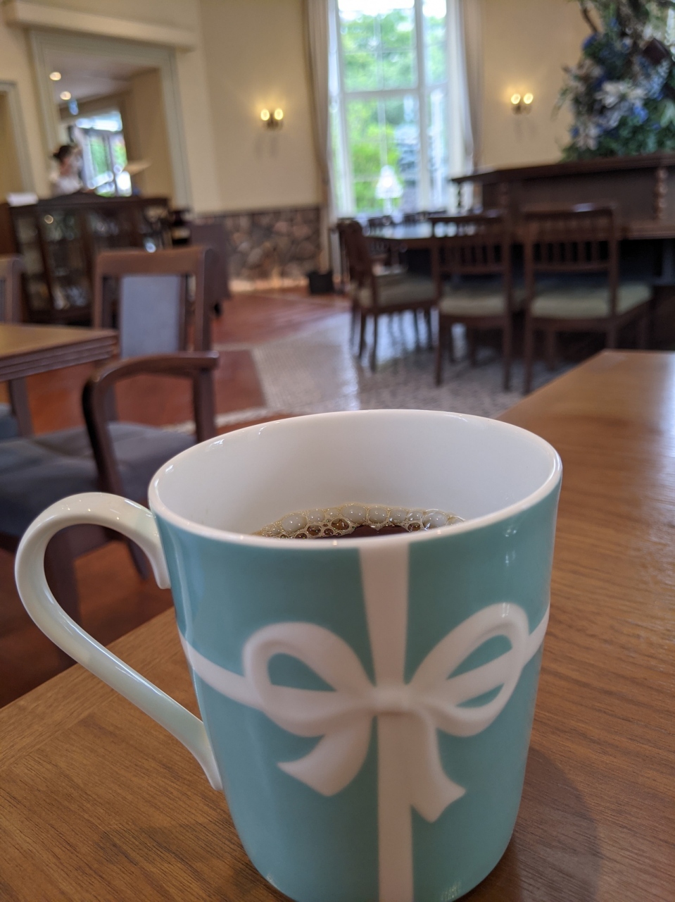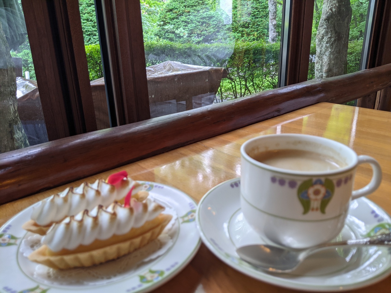 万平ホテルの1階にあるカフェテラスは緑あふれる敷地内を見渡せる落ち着いた雰囲気のカフェです。ジョンレノンが作り方を直伝したといわれるロイヤルミルクティーが有名なようですが、この日はコーヒーとレモンパイをいただきました。レモンパイは想像以上に酸っぱかったです。