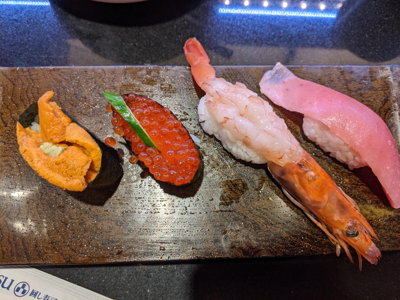 池袋西武8階のレストラン街にある回転寿司店、いつ通りかかっても行列ができていてなかなか入ることができませんでしたが平日の11時の開店と同時に行くとぎりぎり入店できました。高級寿司店のクオリティを手軽に回転寿司で提供するというコンセプト通り、美味しいお寿司をリーズナブルな価格でいただくことができました。
