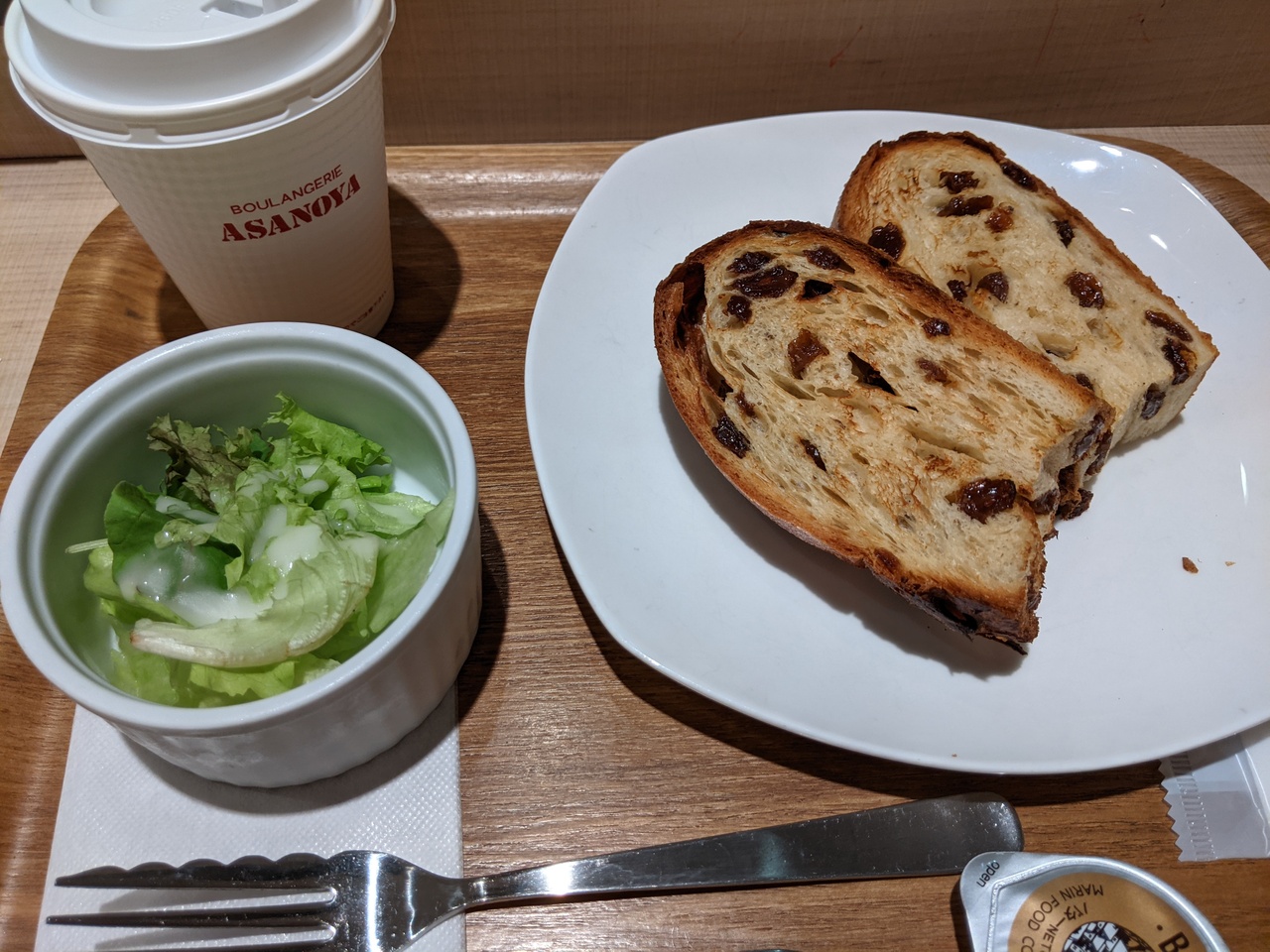 モーニングにはパンとコーヒーとプチサラダのセットが510円。軽井沢レザンはたっぷりのレーズンに柔らかいパン、周りはサクサクのフランスパン生地でとっても美味しいです!