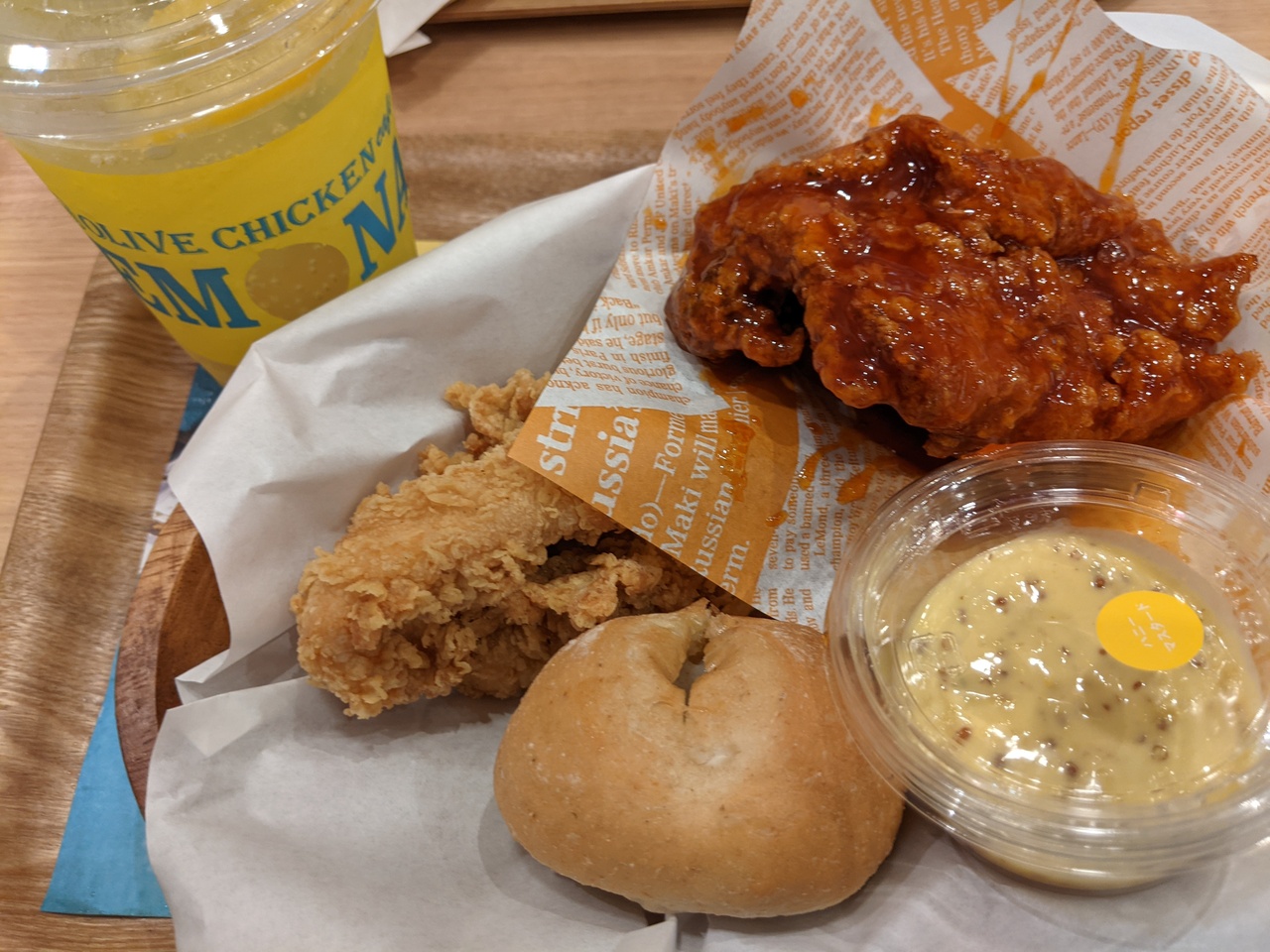 ヤンニョムチキンは辛すぎない甘辛で美味しかったです。チキンフィンガーにつけるハニーマスタードも美味。