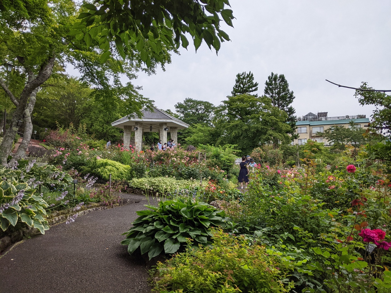 園内にはあじさい、バラと季節の花がきれいに咲いていました。ゆっくり休憩できる茶廊や陶芸体験ができるクラフトハウスなどの施設もありました。- 旅行時期