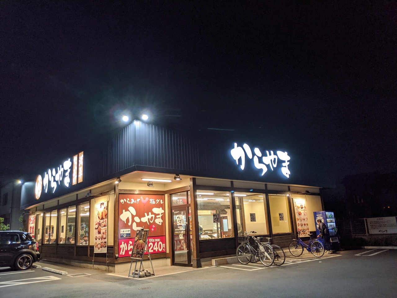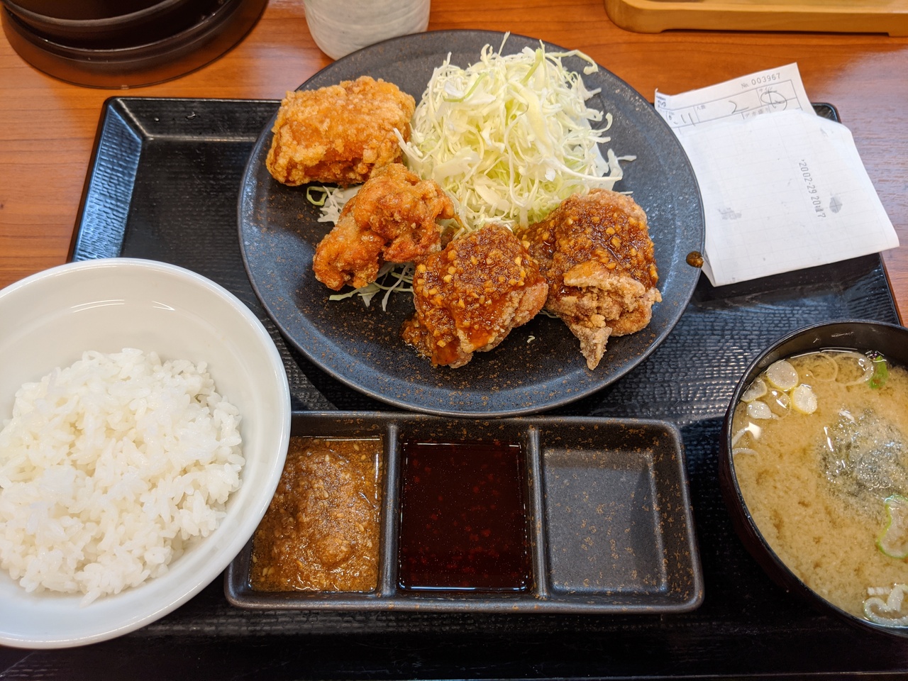 唐揚げのチェーン店のからやま、休日の夜は混み合っています。店内で食べるだけでなく持ち帰りメニューも充実していますが、店内でいただく場合にはテーブルに塩辛と沢庵の壺か置かれていて食べ放題なのが嬉しいです。