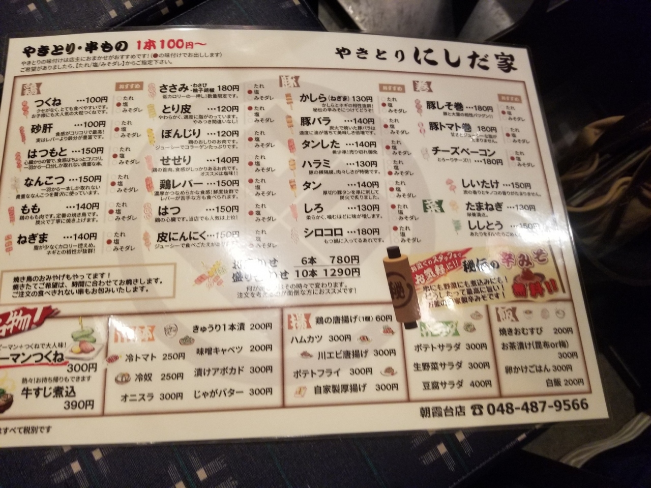 東武東上線朝霞台駅南口を出てすぐ、吉野家のお隣です。バス停目の前なので持ち帰り用はバス待ち時に便利そうです。店内メニューは焼き鳥だけではなくおつまみメニューも豊富でリーズナブル!煮込み豆腐が100円、小松菜煮浸しは180円。仕事帰りの独り飲みにも最適だと思います。