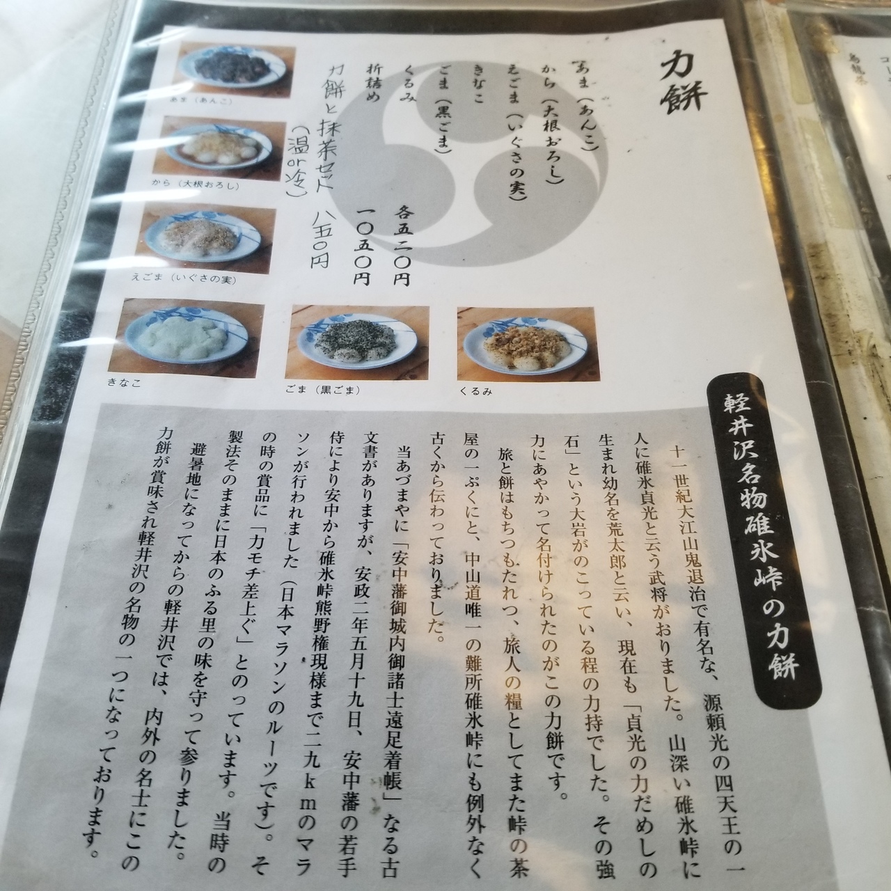 ここで必ずいただくのが「峠のちから餅」柔らかいお餅にあんこやきなこ、からみなど6種類から選べます。