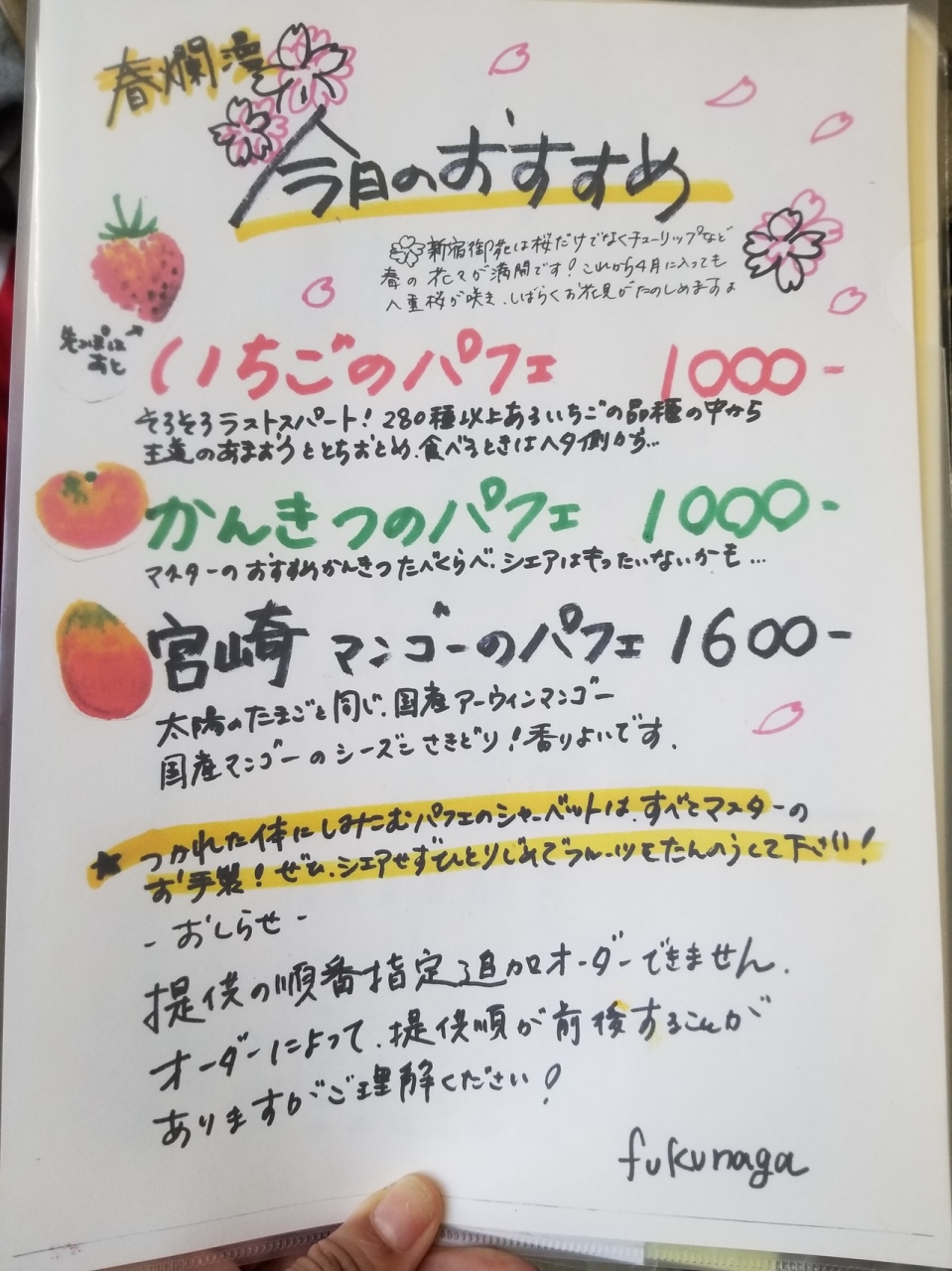 四谷三丁目駅を四谷方面に少し進んだところにあるビルの2階のフルーツパーラー、1階は果物屋さんです。キレイでもお洒落でもないお店ですが、新鮮な果物を使ったデザートは絶品。季節毎に変わるフルーツのパフェは全制覇したくなります。15時からという微妙な開店時間にもかかわらず、15時すぎには階段したまで行列ができていました。