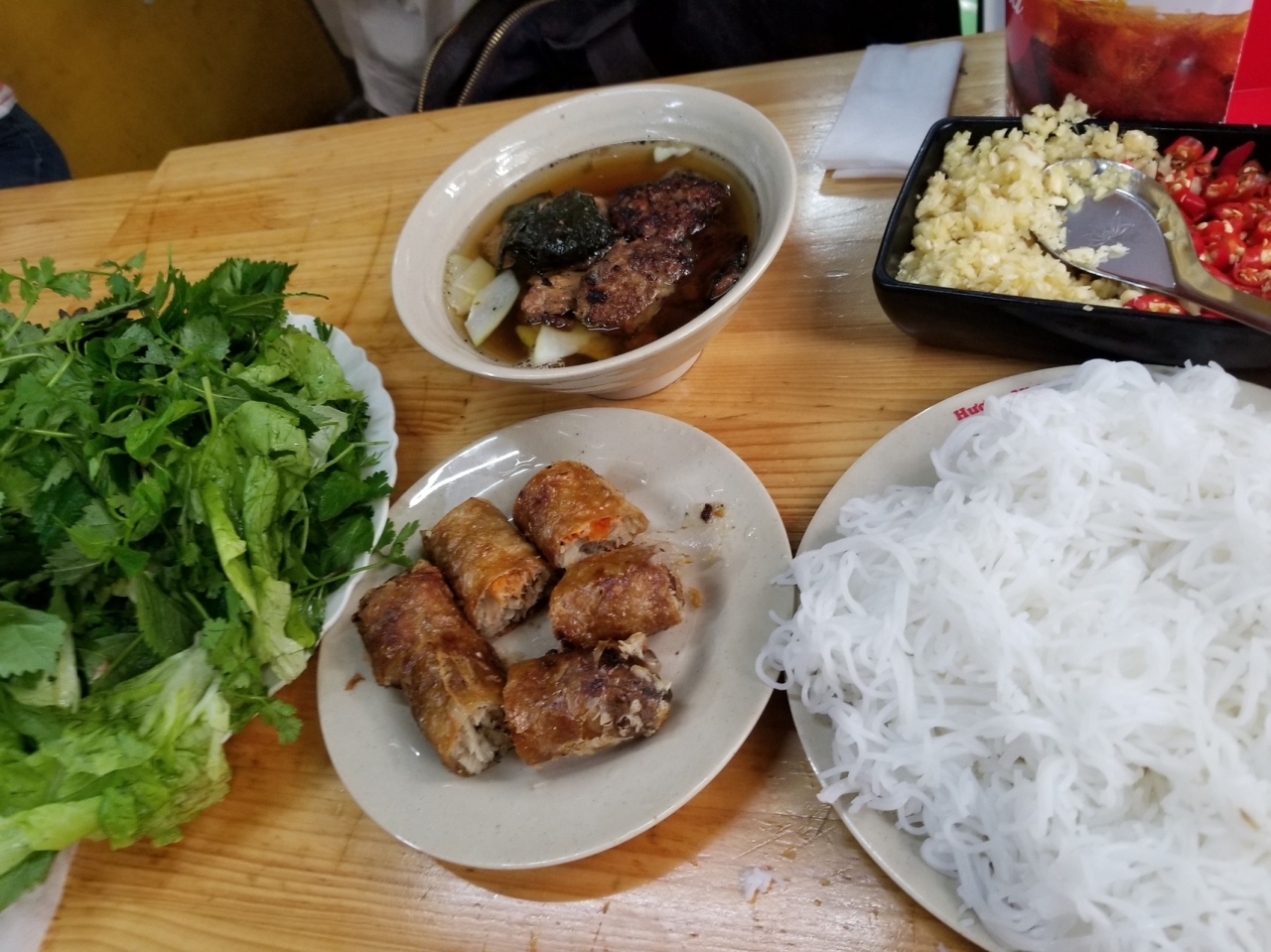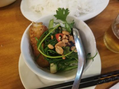 ハノイの名物料理、ブンチャーのお店。なかでも人気店のようでお昼を過ぎた時間にもかかわらず混んでいました。甘めのつけ汁には炭火で焼いた肉とつくねが入っていて、そこにブンと野菜を入れていただきます。揚げ春巻も一緒にいれるとボリュームもup。とても美味しかったです。