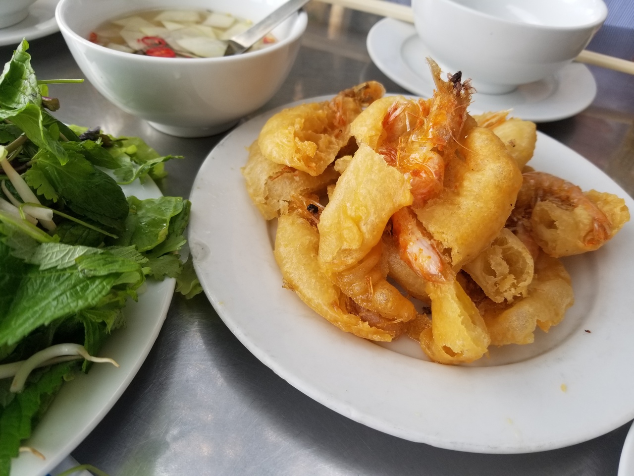 ホアンキエム湖南部のお店。ガイドブックに載っていた『エビの塩とうがらし炒め』が美味しそうだったので夕飯はこちらのお店へ。見た目通り美味しかったです。豆腐の黒胡椒揚げもgood!!ただ混んでいるわけでもないのに呼んでもなかなかオーダーを取りに来てもらえなかったり、接客がいまいちでした。