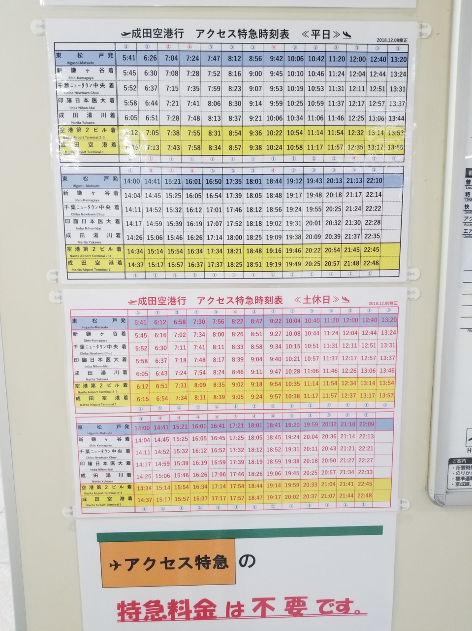 東松戸から成田空港まで利用しました。武蔵野線からの乗り換えはエスカレーターあり、都心の駅のように混み合わないのでスーツケースを持っての移動も楽です。電車は普通のロングシート、私が乗った時(連休最終日の朝)はがらがらでした。時間帯によっては混むのかまた検証してみたいと思います。
