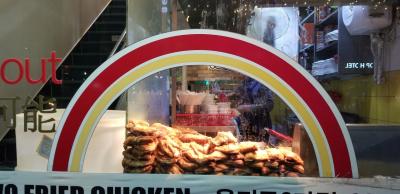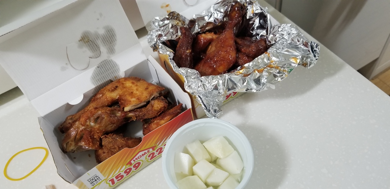韓国といえばチキンにビール(メクチュ)欠かせません(^з^)-☆深夜の東大門ショッピングの帰りに立ち寄り、ノーマルなチキンと甘辛のヤンニョムチキンをハーフアンドハーフで購入。コーラと大根の漬物を付けてくれました。コンビニでビールを購入し、ホテルでチメク。ヤンニョムはかなり辛めでしたが美味しかったです!
