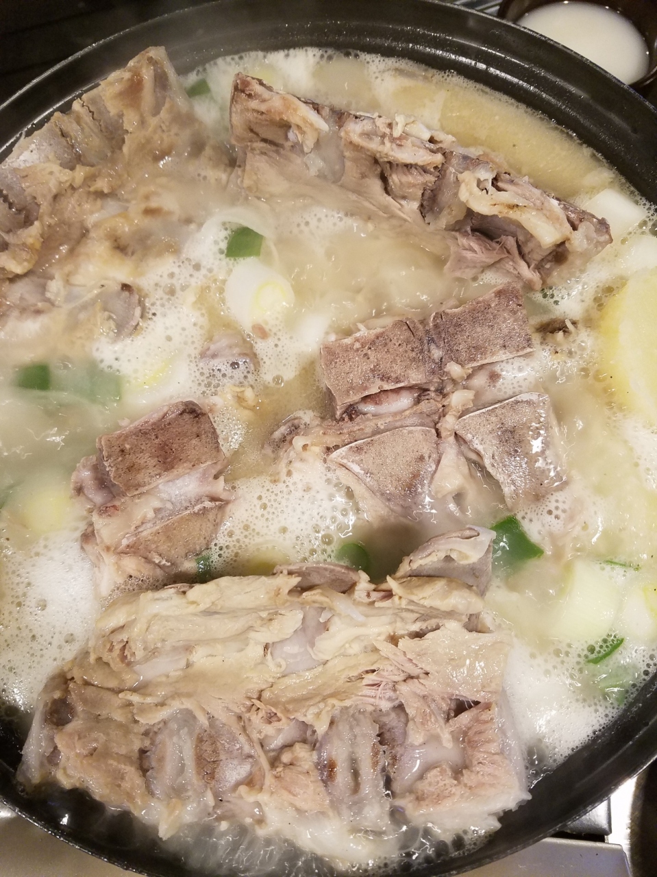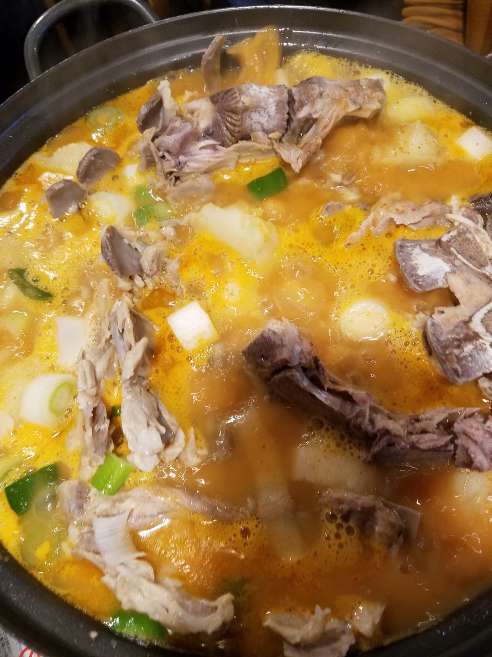 豚の背骨肉とジャガイモの鍋、カムジャタンのお店です。辛味のある赤いスープのものが一般的だと思いますが、こちらのお店は辛くない白いスープのものがあるのが特徴的です。白はコクのあるスープが美味!辛いのが苦手な方でもカムジャタンが楽しめるのがいいです。唐辛子もついてくるのでお好みで辛くすることができるのも良いです。