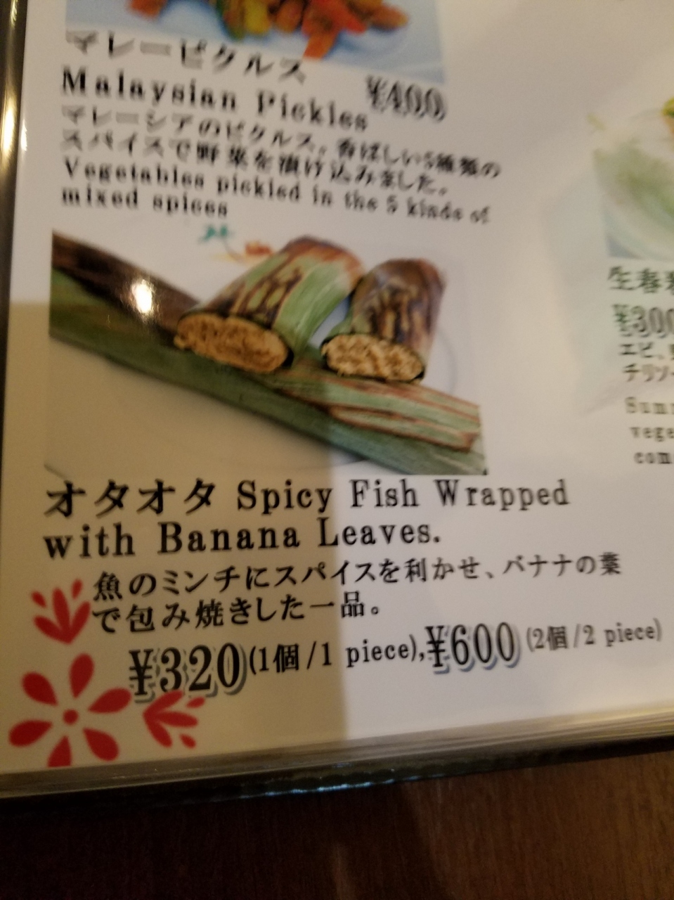 生春巻やサティ、オタオタ、ムルタバといったお料理がひとつづつ楽しめて良かったです。お味も美味しかったし、お店の方も感じが良かったので次はもっと本格的にお料理をいただきたいと思いました。- 旅行時期