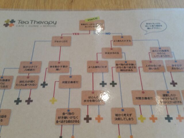 まずはお茶、フローチャートでおすすめのお茶を選べます(日本語のフローチャートやお茶の説明付のメニューがあります)