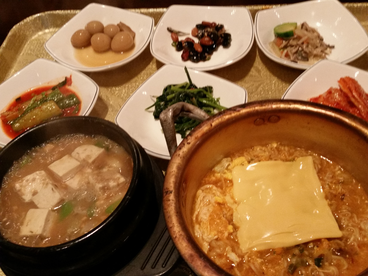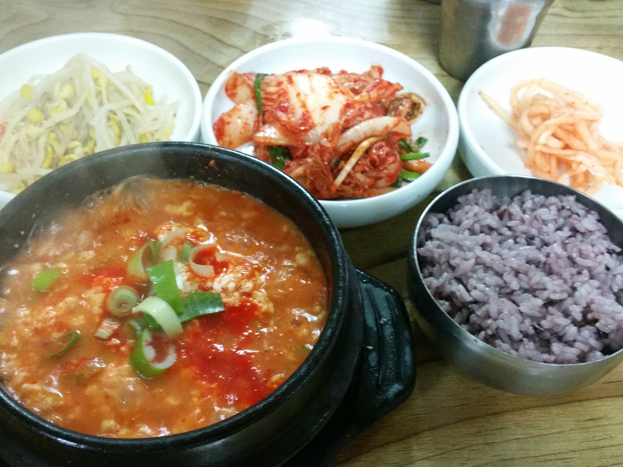 白いのは自然式スンドゥブ、ネギの入った醤油でいただきます。