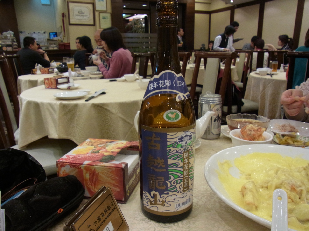 まず、テーブルにつくと、お通し的なナッツ類が出てきますが、ガイドブックに載っている店の切り抜きを持っていくと、紹興酒(古越龍山)が1本サービスされます。