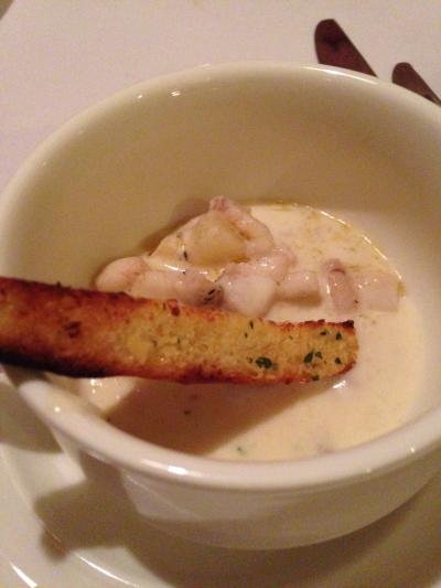 前菜のシーフードチャウダーが特に美味しかった。マンゴーシェイクもどうぞ。