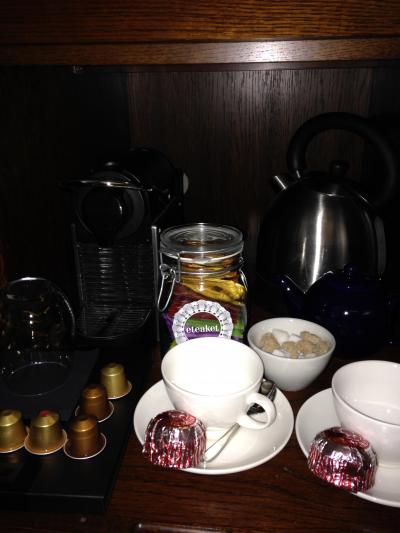 ドライヤー、ストレートヘア用コテ、卓上の拡大鏡、ソーイングセット、耳かきセット、シューミット、シャンプー、リンス、ボディーローション、石鹸、タオルのほかに厚手のバスローブもあります。アイロンとアイロン台。空気清浄機。無料のWiFi。ネスプレッソ。紅茶数種類のパックが多数。Tea Cake(お菓子)。ペットボトルのミネラルウォーター。