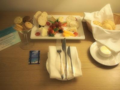 チェックインが終わってお部屋に行くと、ウェルカムフードが。パンやチーズやフルーツ、更にお菓子までついていて、美味しくいただきました。