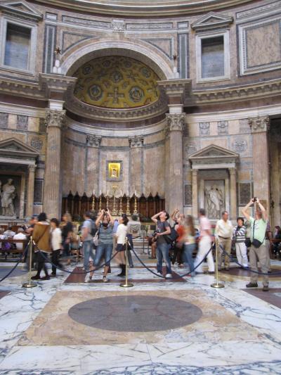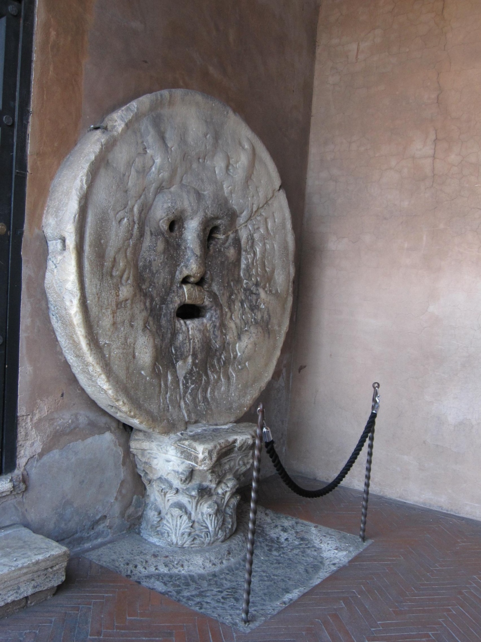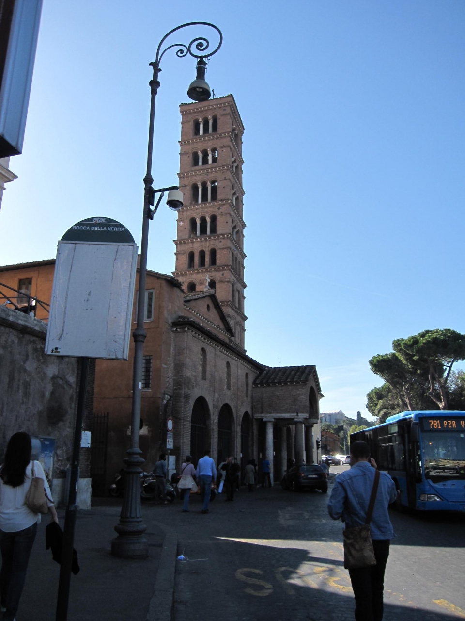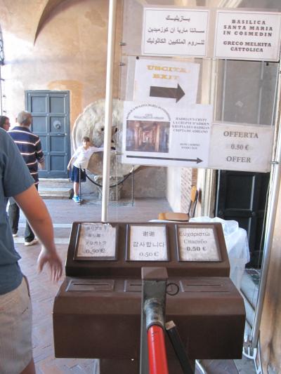 パンテオンの丘を見学した後にチルコマッシモ経由で徒歩で行きました。チルコマッシモはガイドブックには偽警官が多いとか出てたので遠回りしようか迷ったのですが、行ってみたら平気でした!歩道は歩かずに真ん中?を歩いていたからかな?車や人も気にせず歩けるのでいいと思います。肝心の真実の口は教会へ入って左側の列に並びます。私達は11時くらいに行ったのですが空いてましたが終わって買い物して出てみたらすごい行列でした。団体さんが来るとすぐいっぱいになってしまう感じです。お金は€0.50お賽銭箱に入れてきましたが、厳しくチェックはしてないですよ