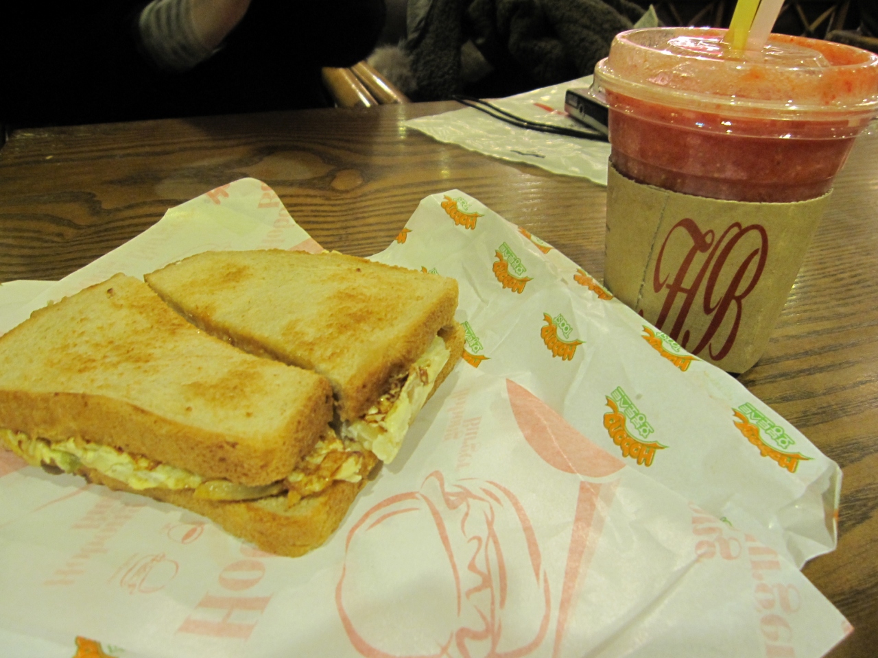 ホテルからすぐ近くという事もあり、行ってきました。店内で食べる所は無いので購入してホテルに持って帰りました。ホボントーストと苺ジュースを購入したのですが、肝心のトーストは少し甘く優しい味がしました。また苺ジュースはとても美味しかった!今度は違う味も試してみたい!