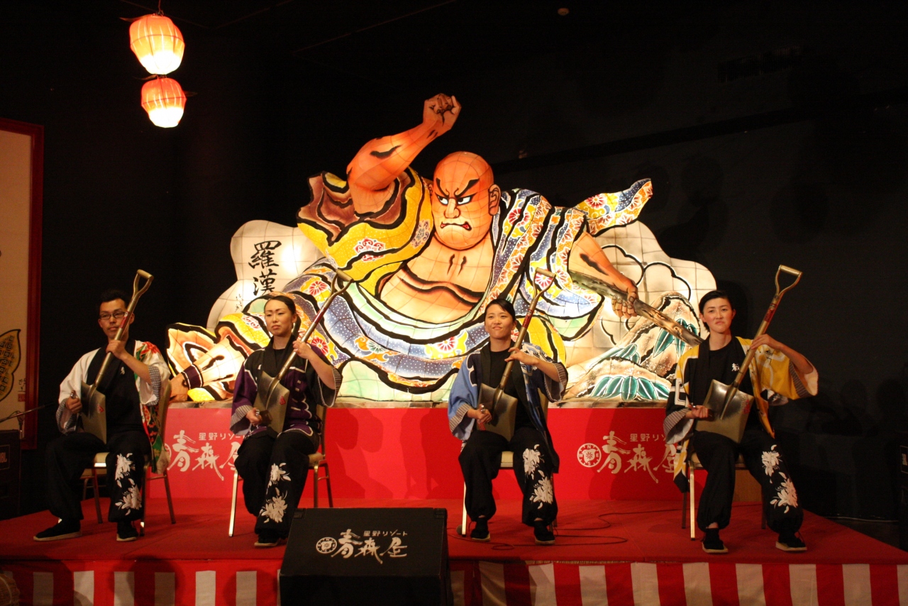 一押しなのが毎晩20:45から開催される「じゃわめぐショー」。「津軽三味線」と民謡から始まり、ばりばりなまっているおばちゃんのトークを聞き、熟練の青森屋スタッフによる青森ねぶたのお囃子も。さらに面白いのがスコップ三味線。栓抜きでスコップをたたいているだけなんだけどこれが面白い!