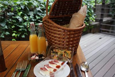 単なるビュッフェじゃなく、ランチピクニック形式。まずは、ランチバスケットを広げ、スパークリングワインとともにチーズやマリネを。