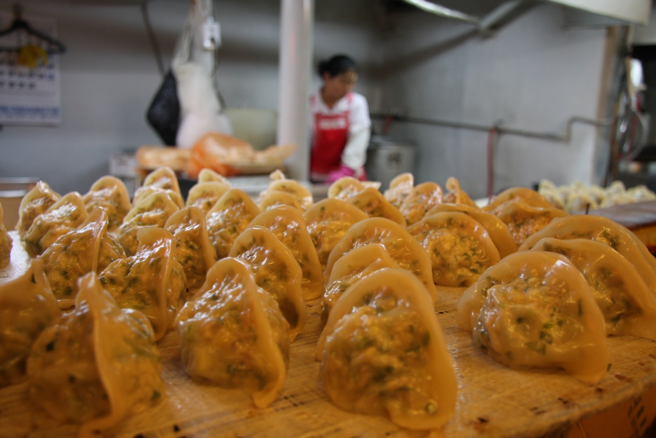 入口には手作りされた餃子がずらーっと並び、チヂミを焼いているいいにおいが・・・