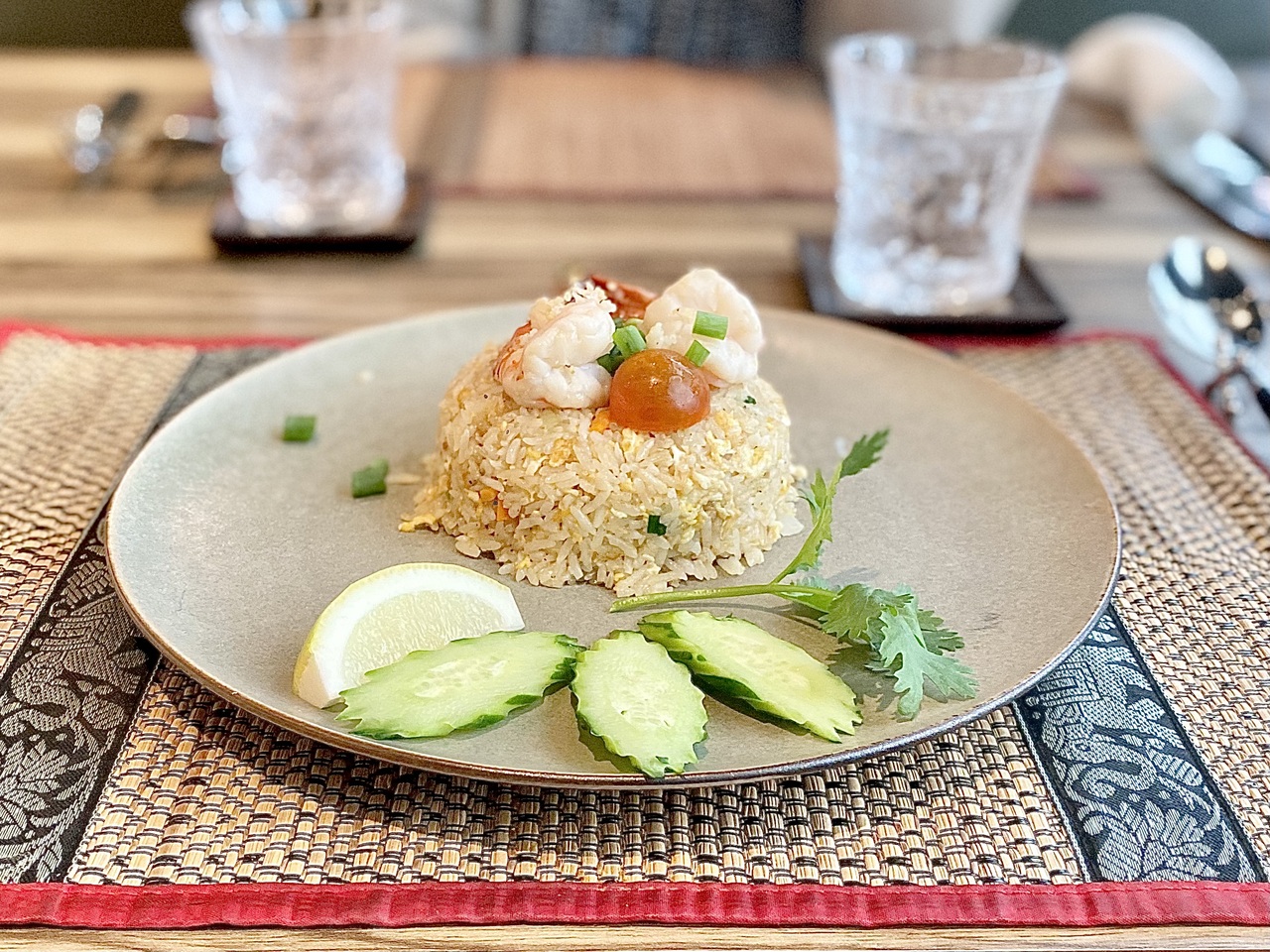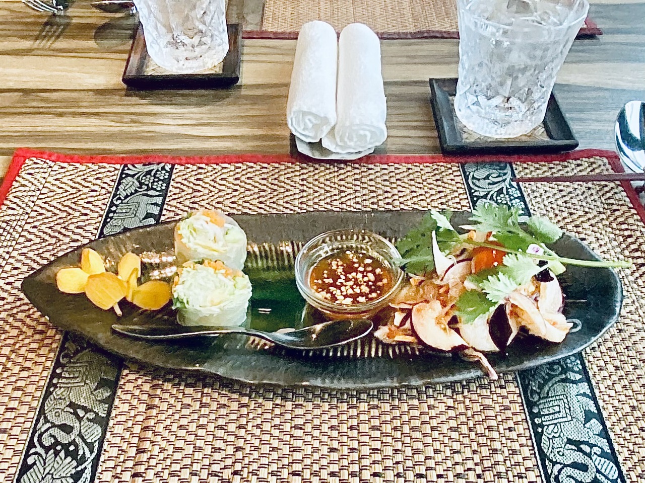 カオパックン(タイのエビチャーハン)のセットで、この他に生春巻きと春雨サラダとデザートが付きます!