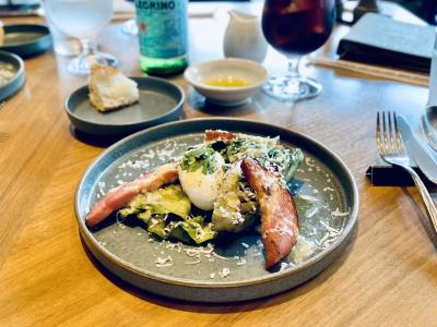 ロメインレタスと厚切りベーコンのグリル・インサラータ ポーチドエッグ添え