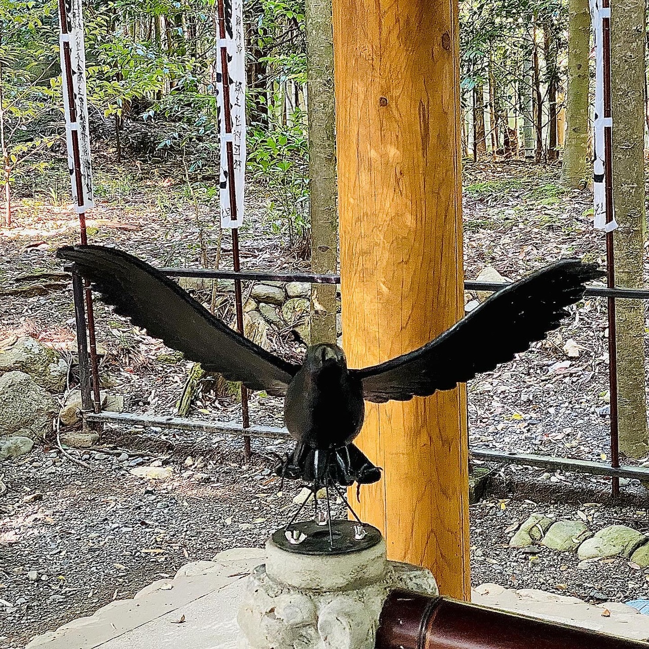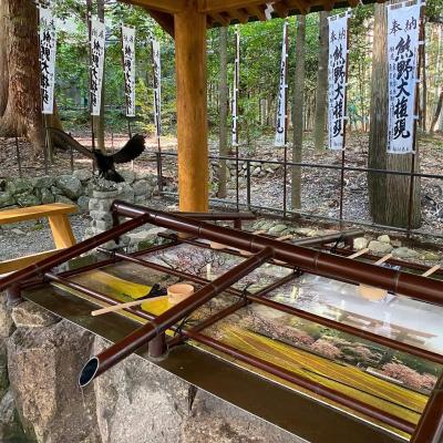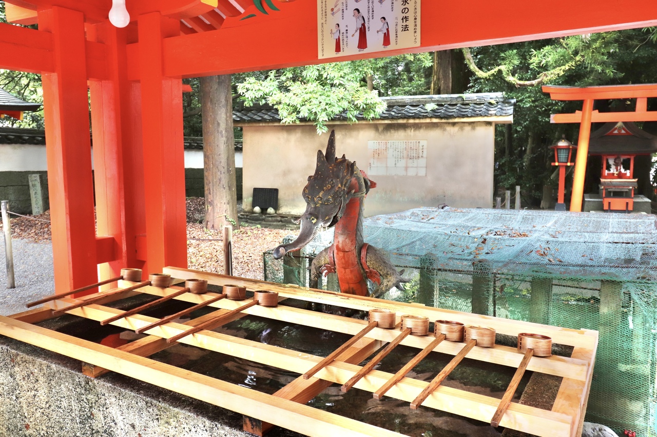 鳥居の前から境内まで、神の使者である八咫烏があちらこちらにあり、手水舎まで八咫烏!