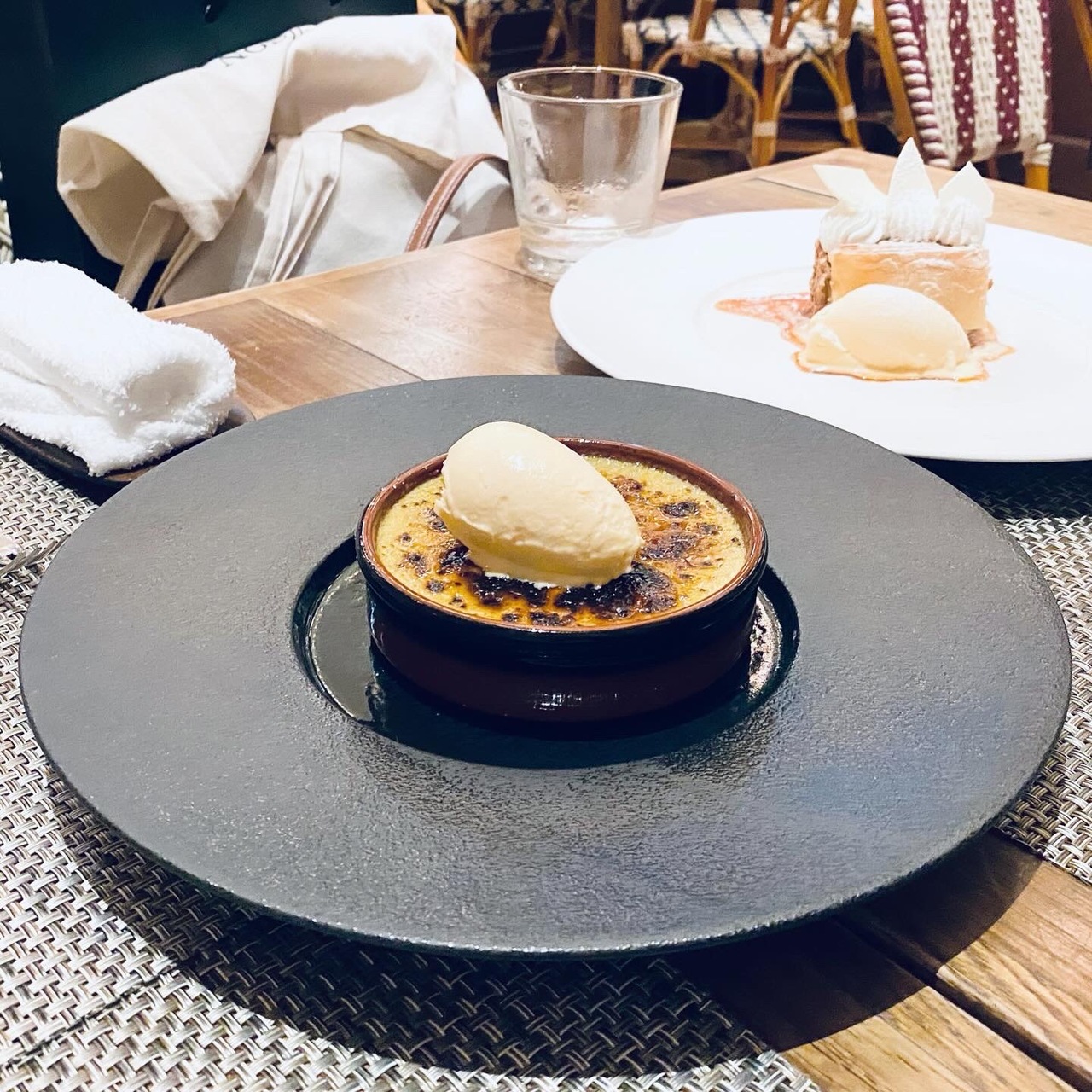 「抹茶のクリームブリュレ 黒蜜のジェラート添え」