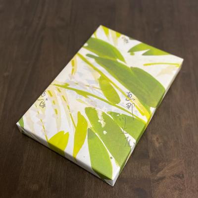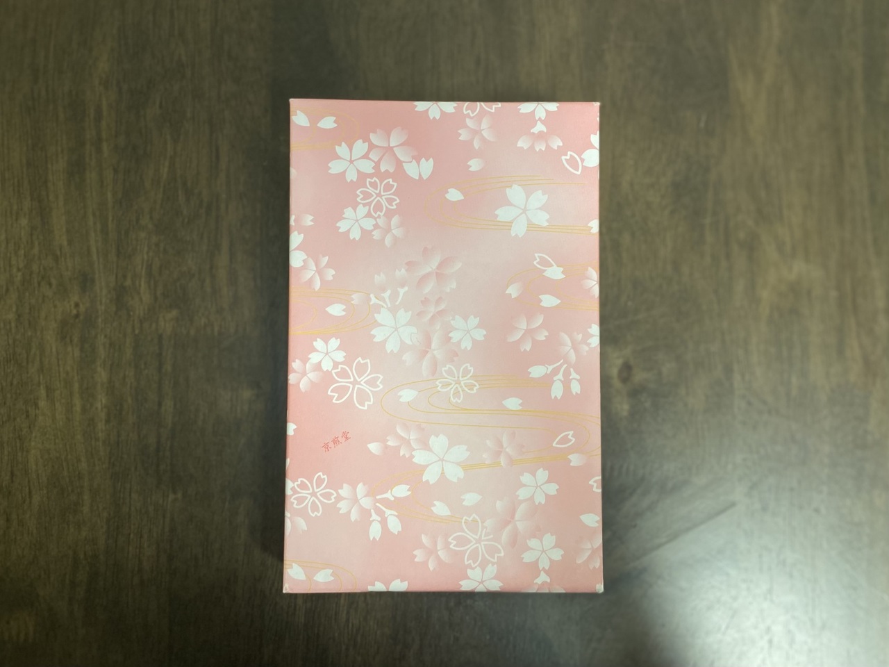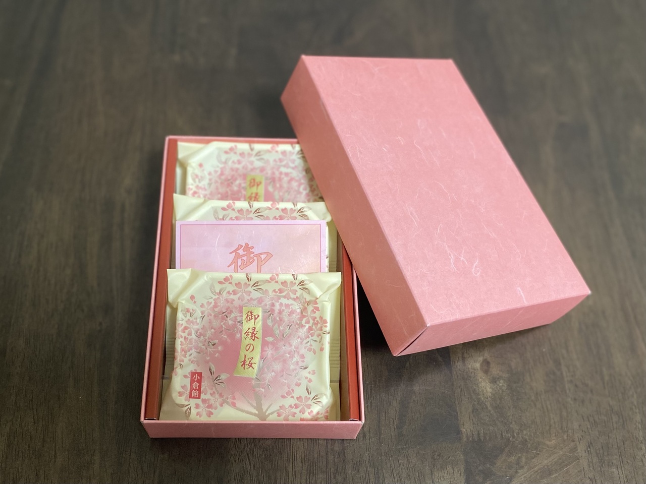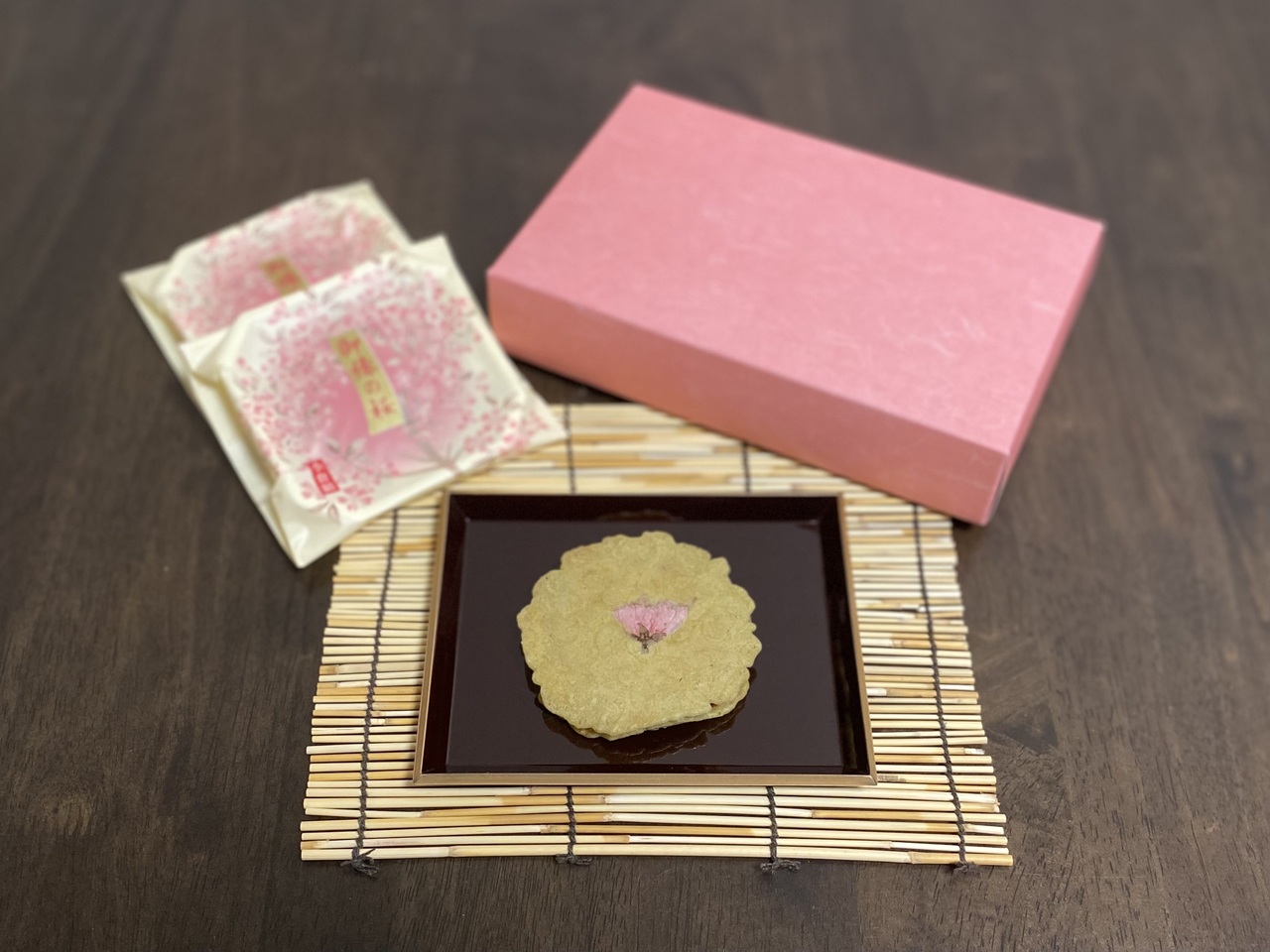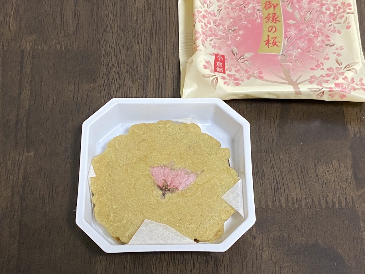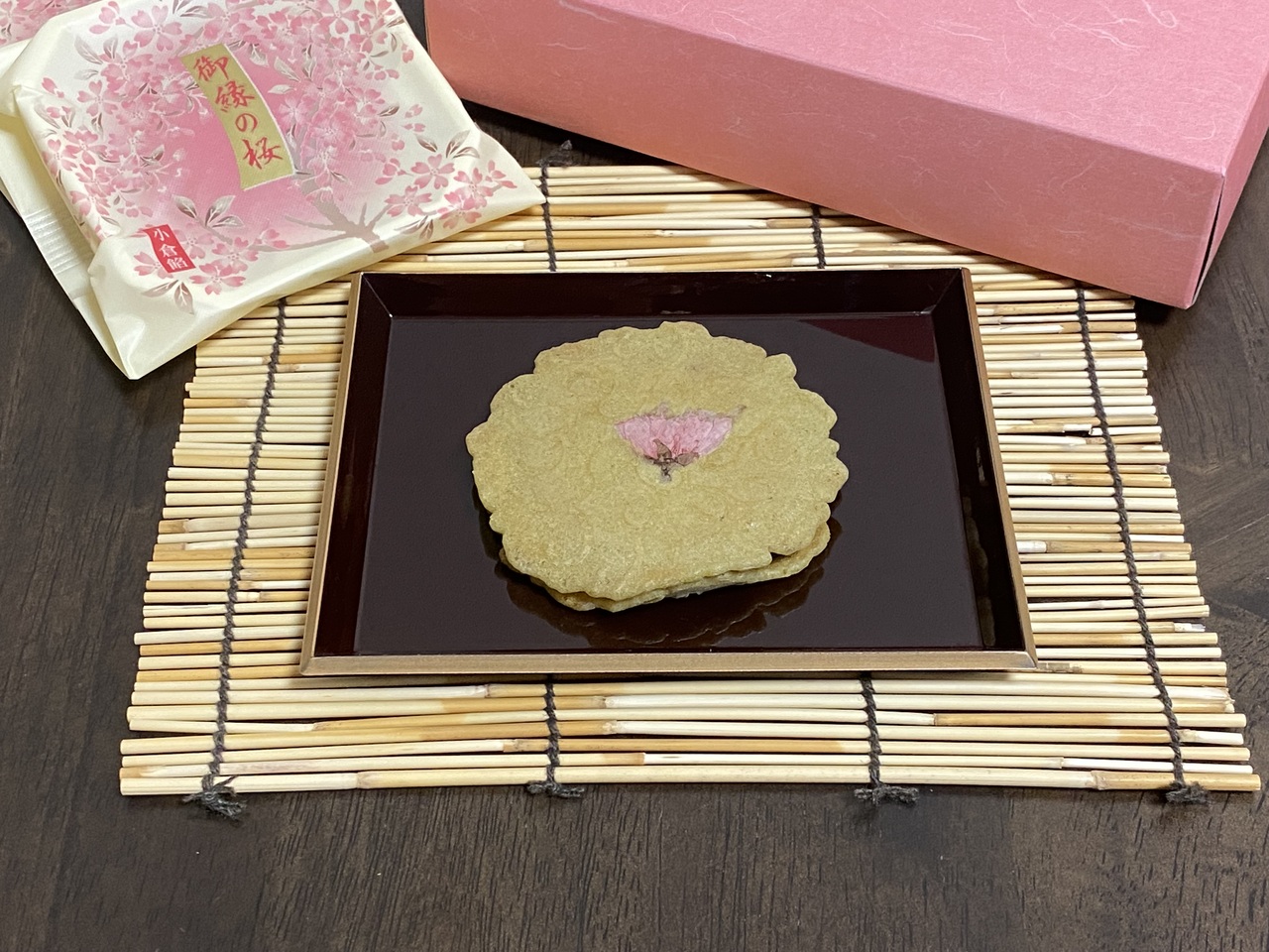 薄く焼き上げたワッフルのような柔らかい抹茶の生地に、しっかりとした甘めの粒あんが挟まっており、桜の塩漬けがアクセントになった京菓子