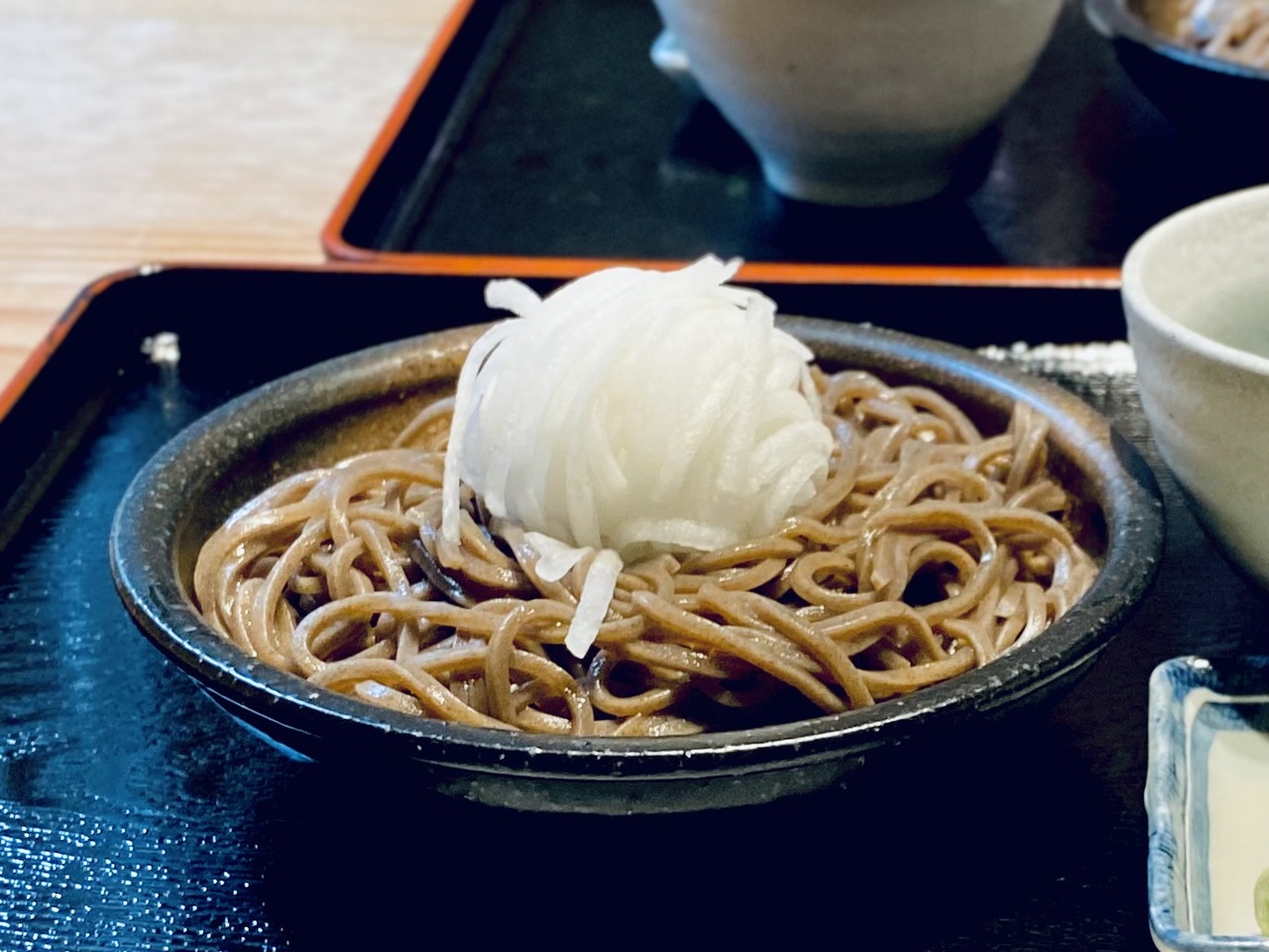 真っ黒でツルツルとしたお蕎麦は店主特製の十割りそばで、その上には細切りの大根が玉のような形状で乗っかっています。