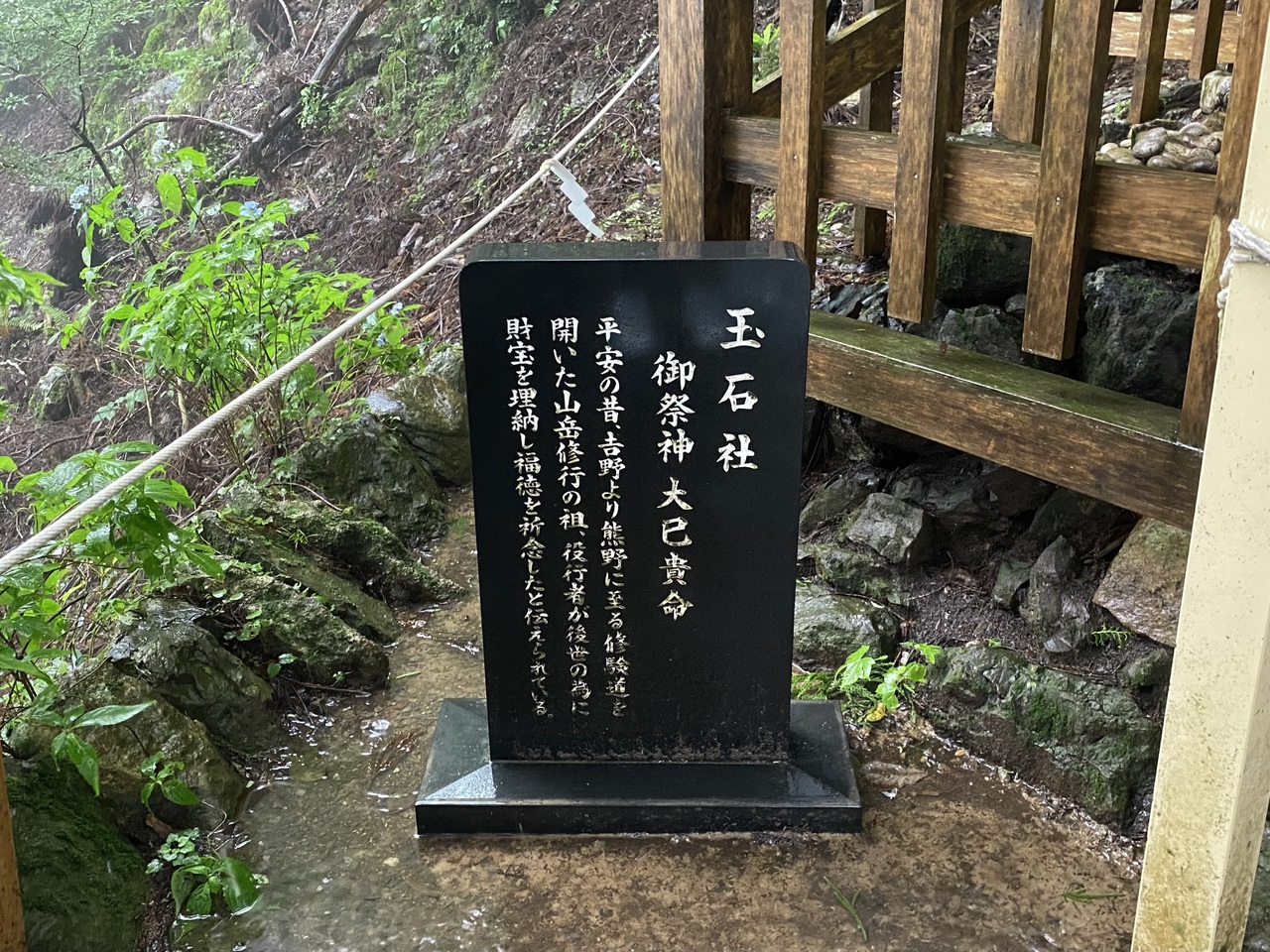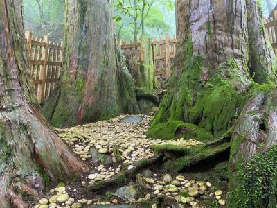 「玉置神社」は、玉置山の山頂直下の9合目に位置するので、駐車場から15分程下ったり登ったりして本殿に向かいますが、暴風雨のせいで道はジャージャーと小川になっていました。