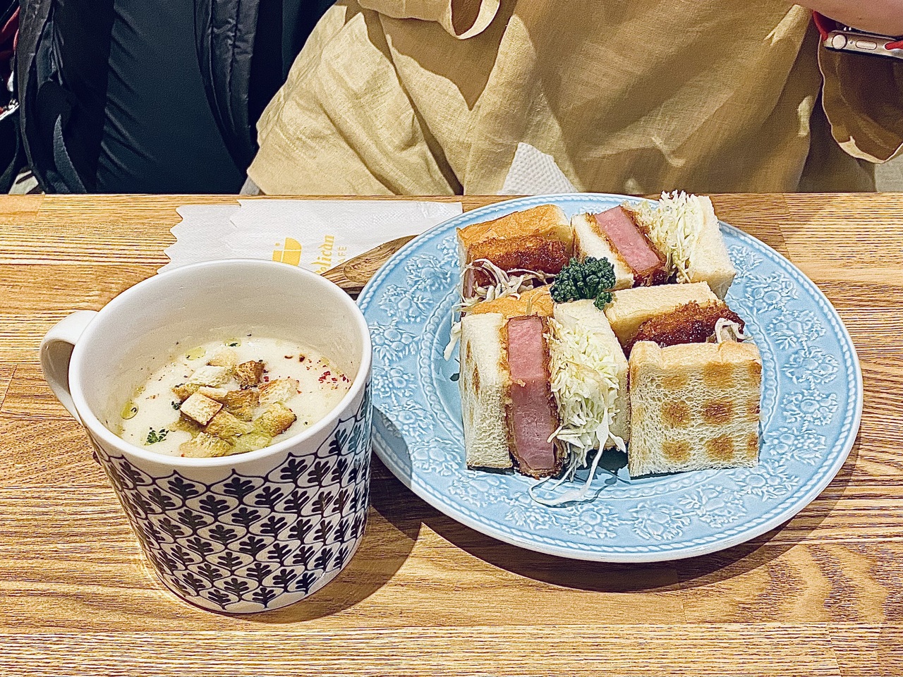 話しを戻して久々に食べるペリカンのパン!私はやっぱり網焼きトーストセットドリンク付き♪で、親友はハムカツサンドと本日のスープに(´∀`*)