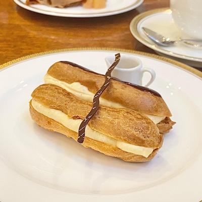 今回は初めてなので、どうやら看板商品らしきエクレアと珈琲のセットと、昔ながらのアップルパイを友人がオーダー♪