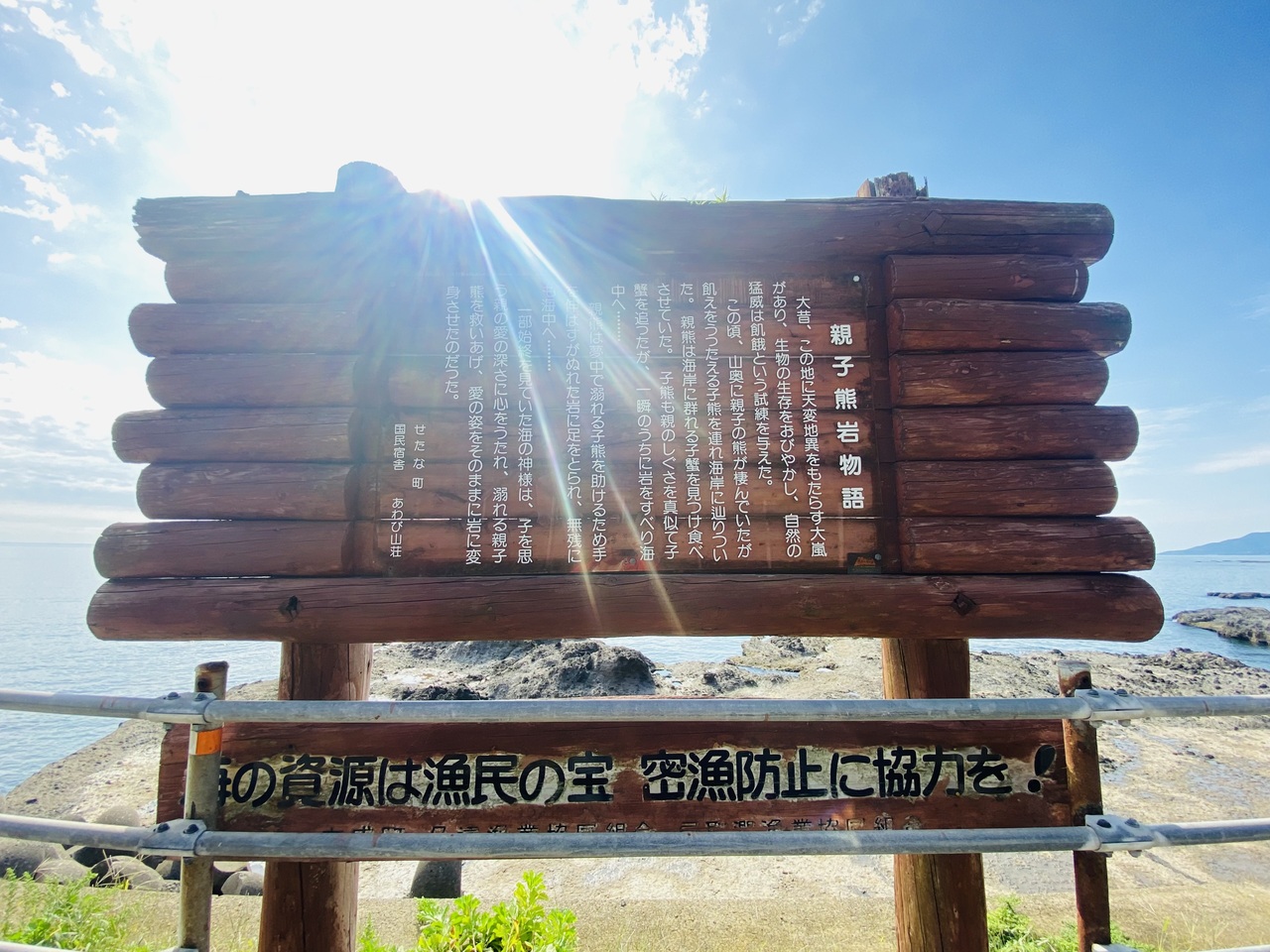 一部始終を見ていた海の神様は、子を思う親の愛の深さに心をうたれ、溺れる親子熊を救いあげ、愛の姿をそのままに岩に変身させたのだった。