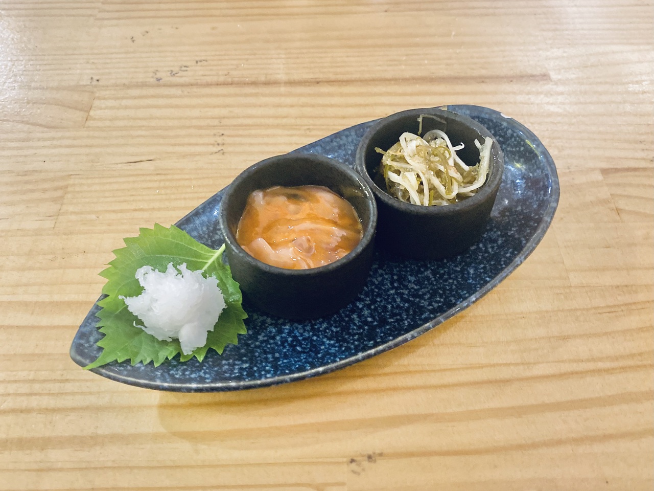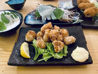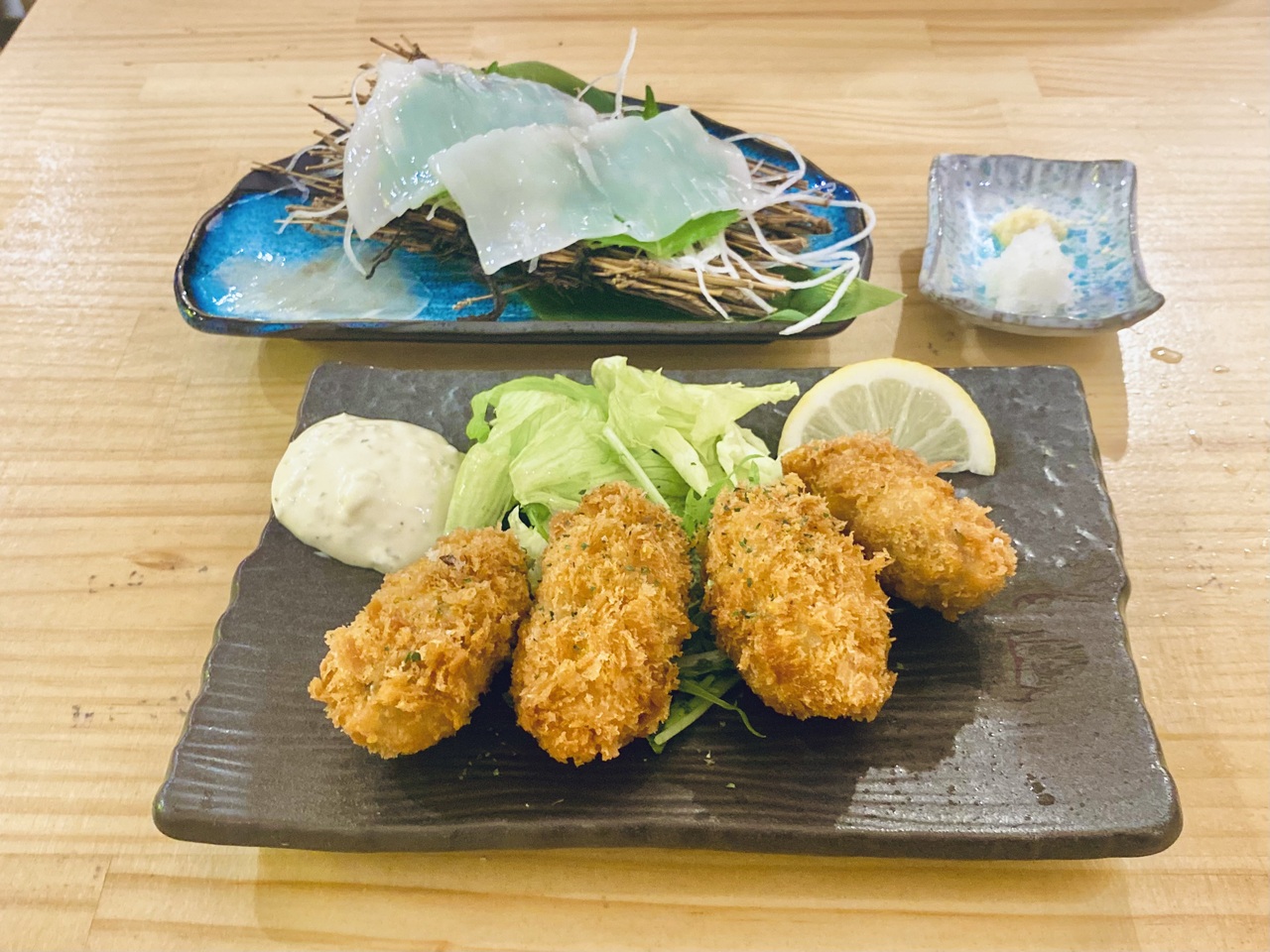 オーダーしたのは、朝獲れのイカ刺し・牡蠣フライ・帆立刺し・塩辛と松前漬け・蛸の頭の唐揚げです。