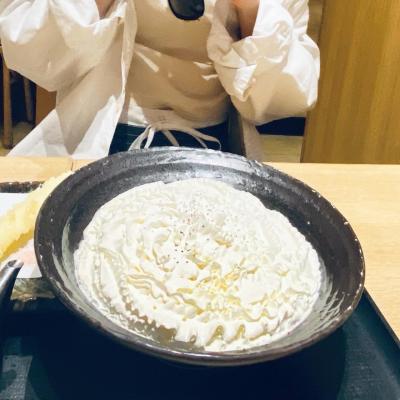 私は"ざるうどん+ちくわ天+イカ天で、娘は"白い明太チーズクリームうどん"にしました。