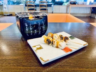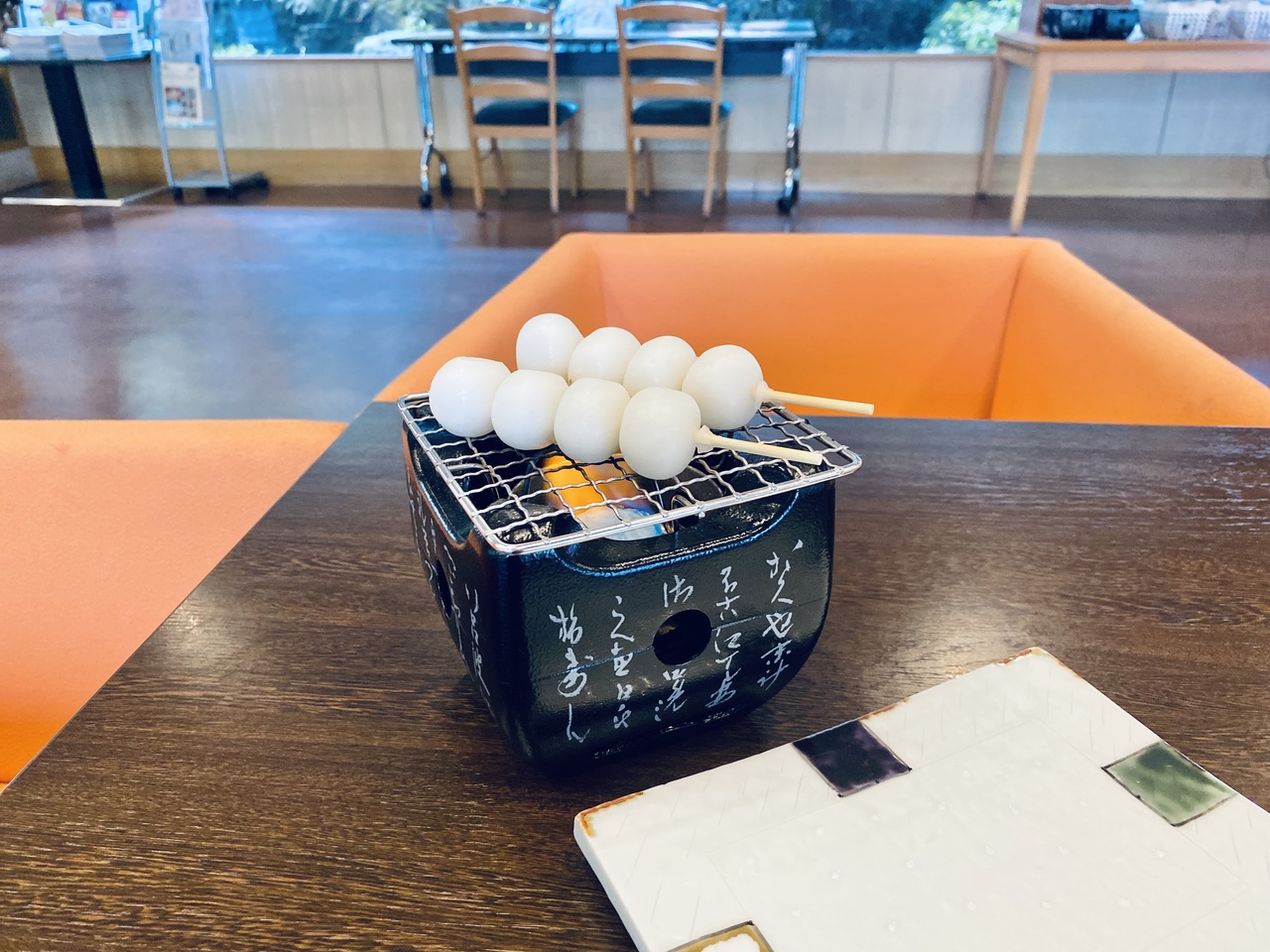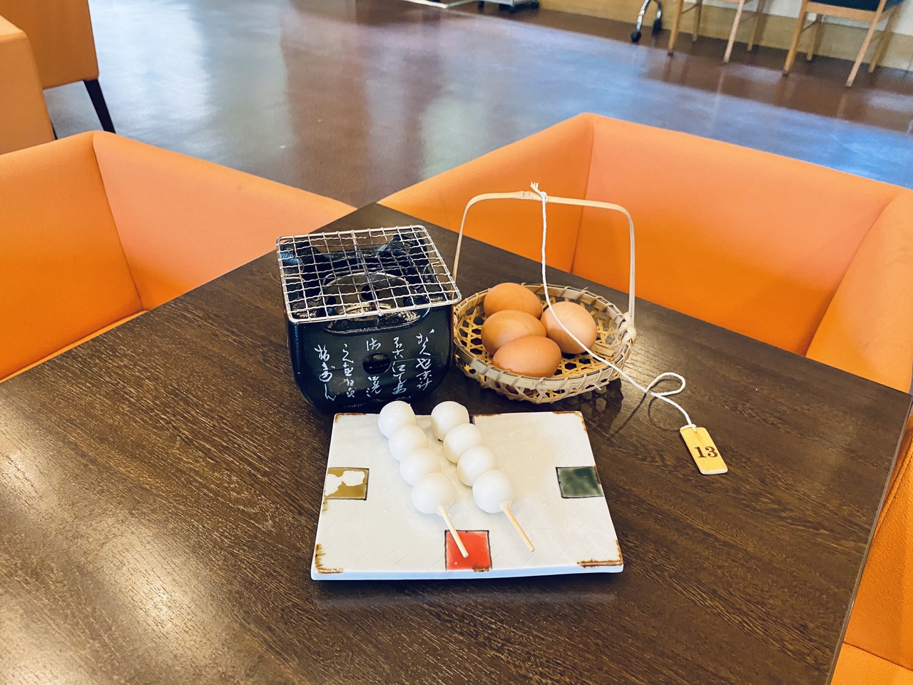 フロントで2本300円の団子を購入し、ロビーに設置してあるコンロを自分で準備して焼く事が出来ます。