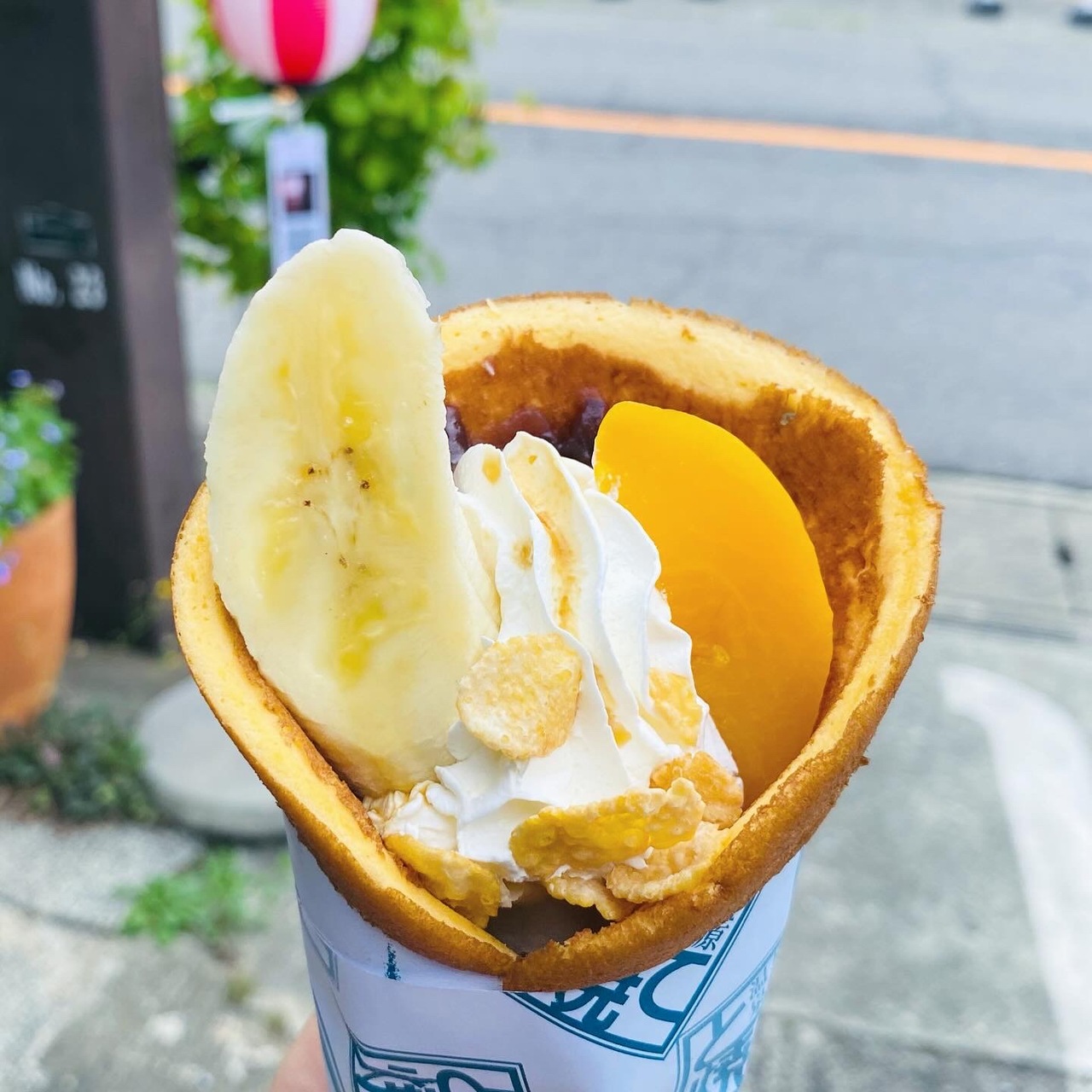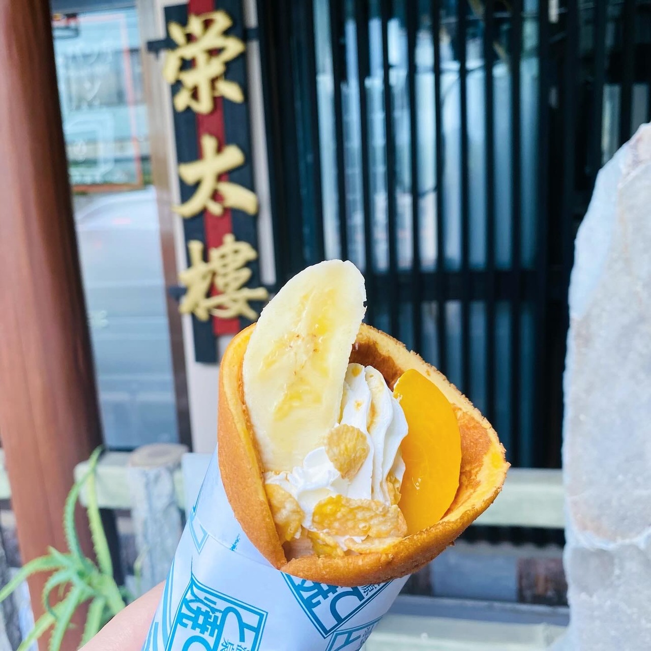 栄太楼の「とて焼き」は、フルーツ•白玉•餡・生クリーム•コーンフレークなど。