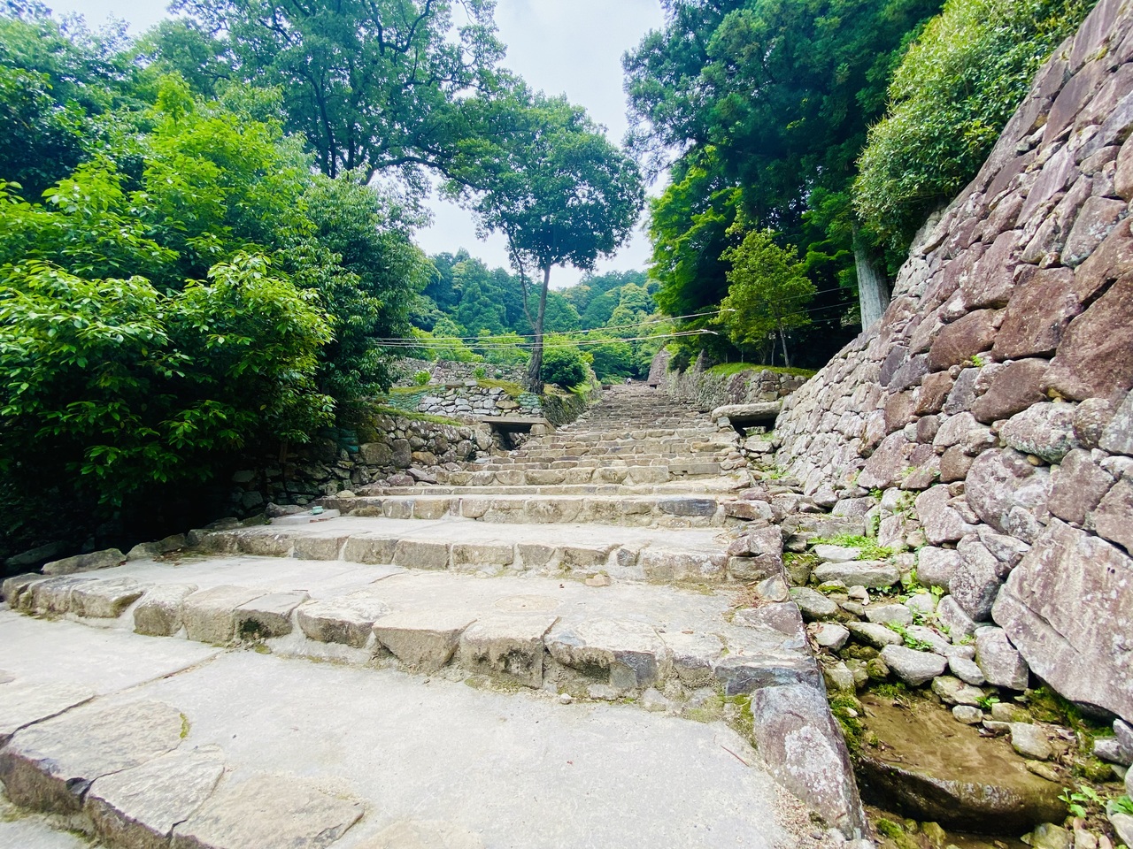 中央の急な階段は、帝(ミカド)が通る階段として整備され、その脇には豊臣秀吉の家や明智光秀のような家臣の家屋跡が配置されています。