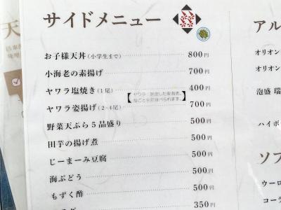 となっており、単品で頼む場合は(刺身・塩焼き・天ぷら・フライ・塩ゆで・素揚げ)を1本から注文出来ます。