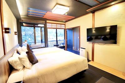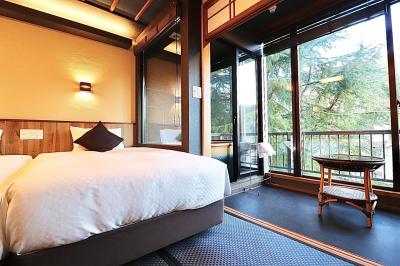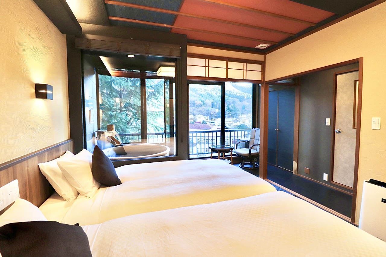 半露天風呂の部屋は色々とあるようでして、今回はコロナワクチン接種割引キャンペーンの為、選べたお部屋は「モダン和室8畳+次間」のみでした。