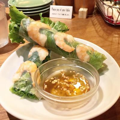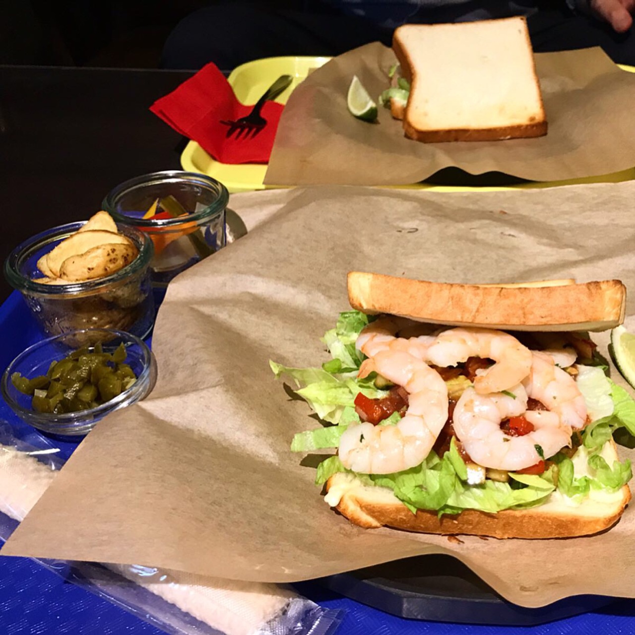 いつもの「クワトロフォルマッジ」ではなく、季節限定の「エスニックシュリンプサンド」! 海老にはナンプラーやパクチーで味付けしてあるそうで、そこにライムを絞るという、またまた私好みですこと♪