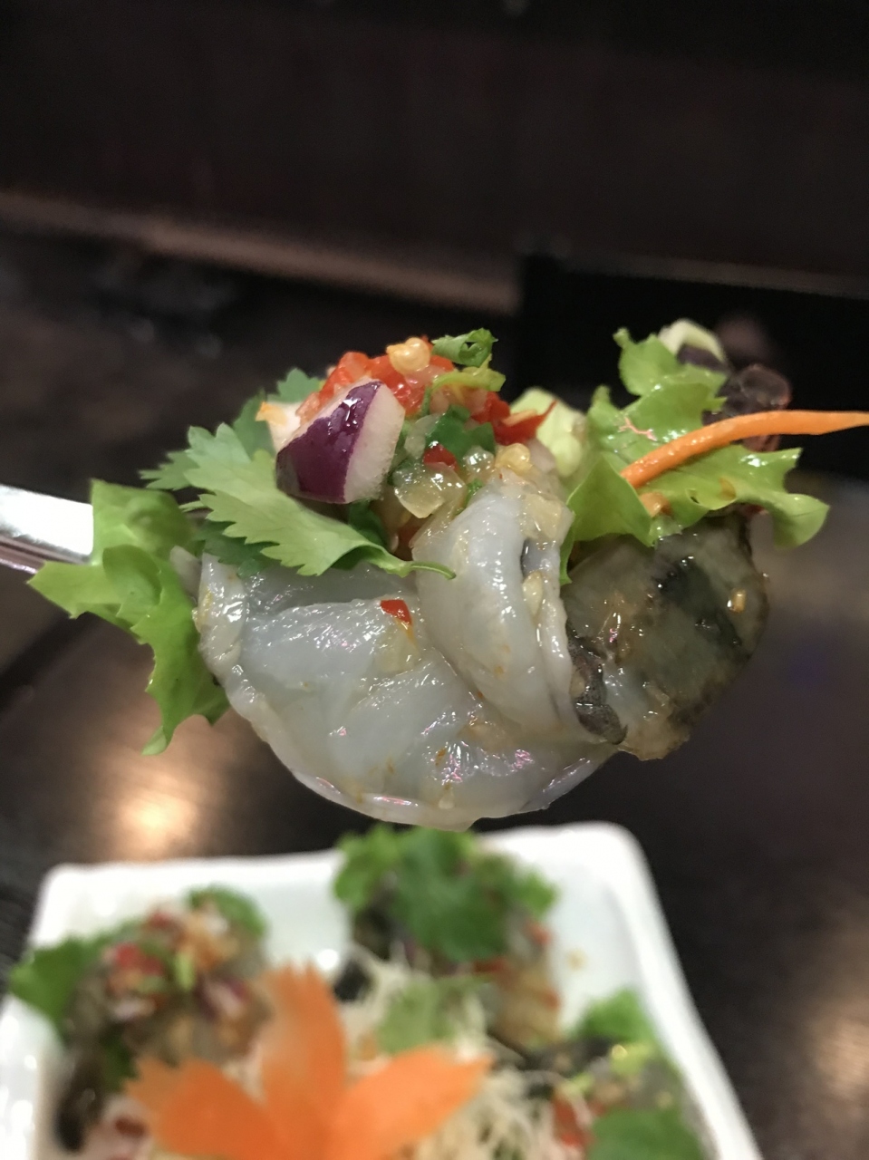 日本では余り見ない、新鮮な生のブラックタイガーに、唐辛子や生ニンニク等が混ざったナンプラーのソースがかかっています♪