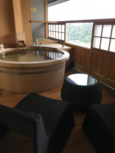 後、露天風呂付き客室ですが、ヒノキ風呂でしょうか。広々としていて、サイドには椅子2脚とテーブルがあります。